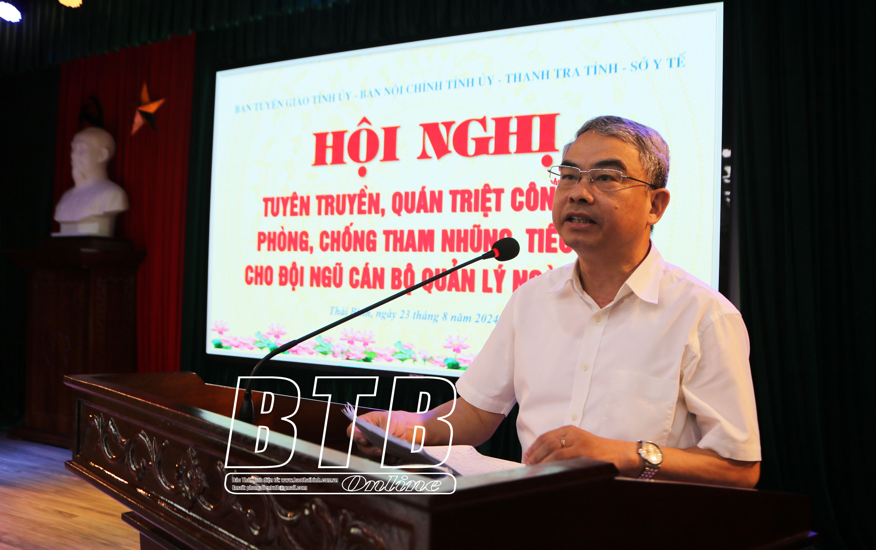 Tại hội nghị, đồng chí Trưởng ban Tuyên giáo Tỉnh ủy nhấn mạnh tầm quan trọng của công tác đấu tranh phòng, chống tham nhũng, tiêu cực góp phần nâng cao vai trò lãnh đạo của Đảng, hiệu lực quản lý nhà nước, xây dựng Đảng và hệ thống chính trị trong sạch, vững mạnh. Công tác đấu tranh phòng, chống tham nhũng, tiêu cực đã và đang được Bộ Chính trị, Ban Bí thư chỉ đạo thực hiện một cách quyết liệt, không ngừng nghỉ và đã đạt nhiều kết quả tích cực, để lại dấu ấn tốt đẹp, được nhân dân đồng tình, ủng hộ. Ngành y tế cũng thường xuyên tổ chức phổ biến, quán triệt các quy định về công tác phòng, chống tham nhũng, tiêu cực; nâng cao y đức, trách nhiệm của đội ngũ cán bộ, nhân viên trong thực hiện nhiệm vụ.