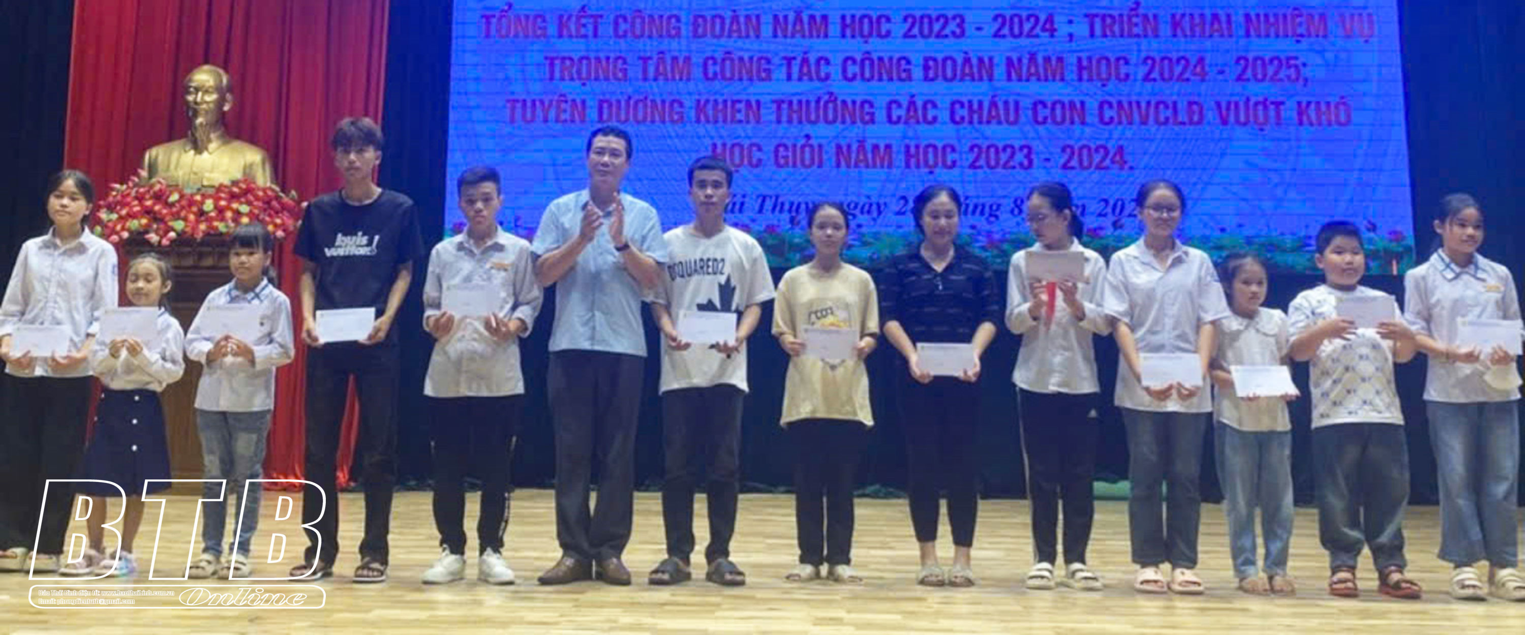 Chiều ngày 28/8, Liên đoàn Lao động (LĐLĐ) huyện Thái Thụy tổ chức hội nghị tổng kết công tác công đoàn năm học 2023-2024; triển khai nhiệm vụ trọng tâm công tác công đoàn năm học 2024-2025; tuyên dương khen thưởng con công nhân viên chức lao động (CNVCLĐ) vượt khó, học giỏi năm học 2023 - 2024.