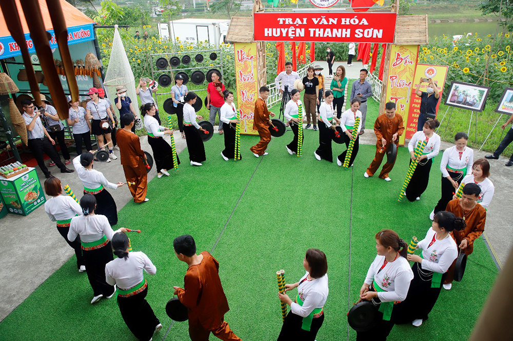 Đội văn nghệ quần chúng xã Yên Lãng biểu diễn cồng chiêng và chạm ống phục vụ du khách tại trại văn hóa huyện Thanh Sơn.