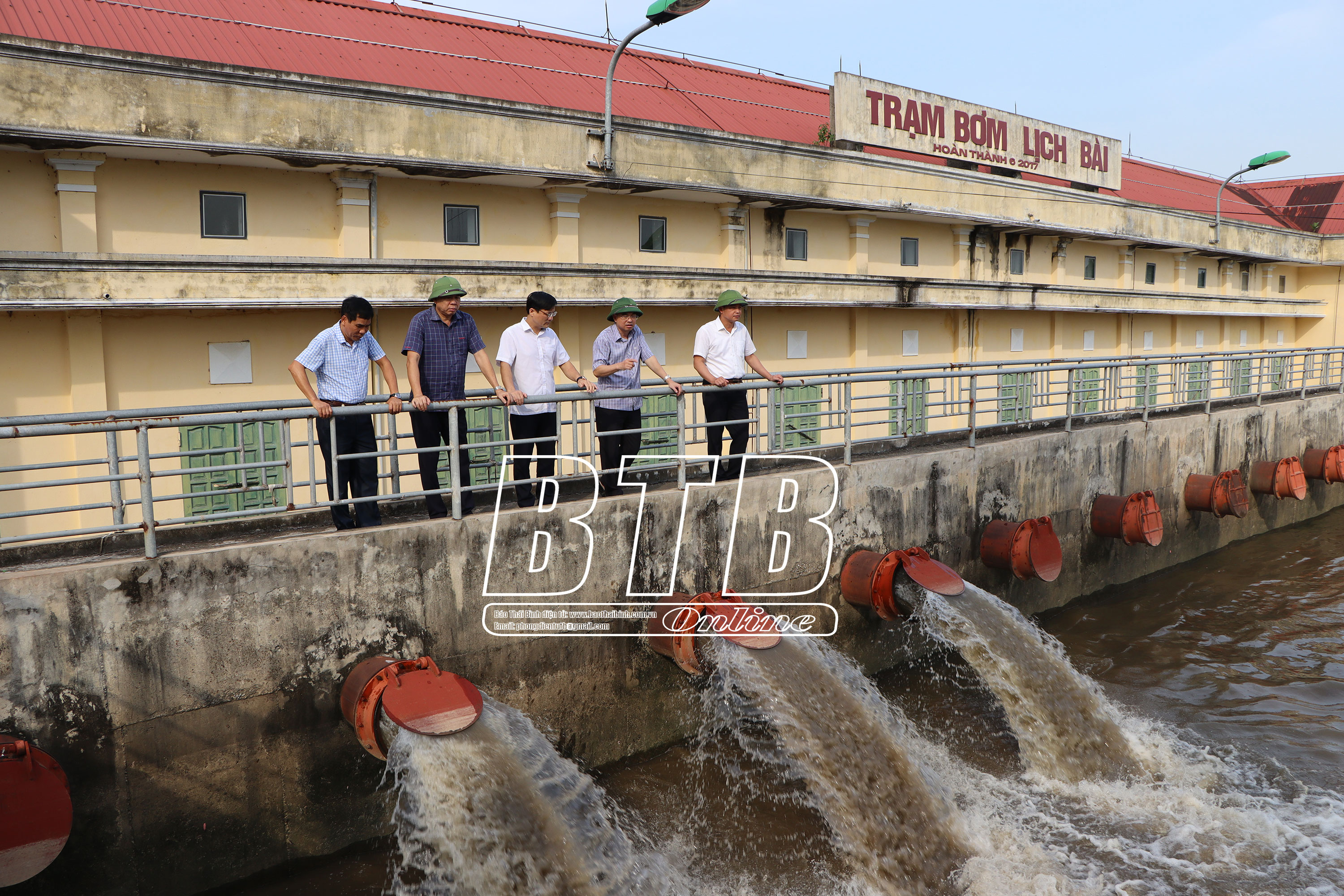 Đồng chí Trưởng ban Tuyên giáo Tỉnh ủy kiểm tra công tác tiêu thoát nước tại trạm bơm Lịch Bài, xã Vũ Hòa.