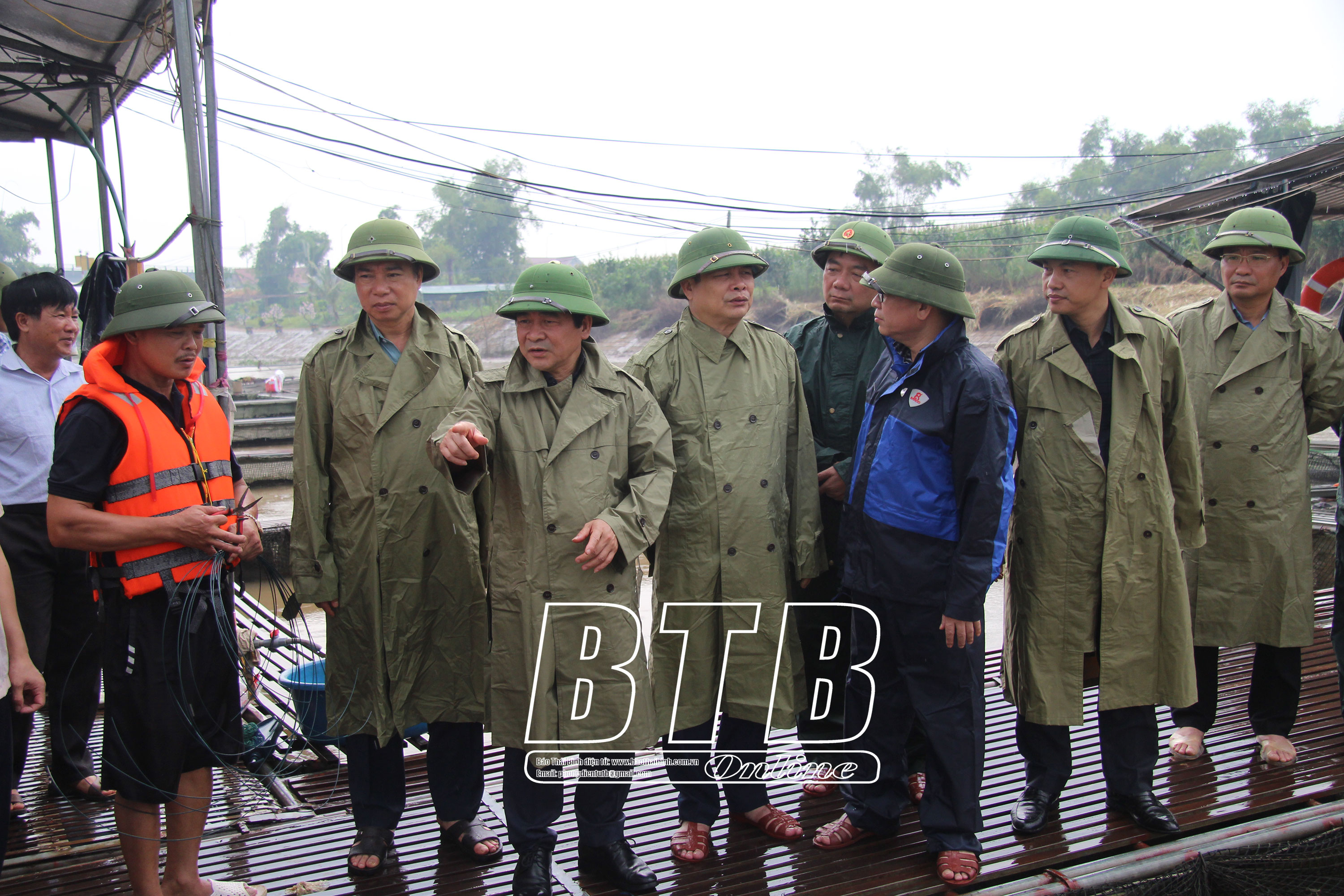 Các đồng chí lãnh đạo tỉnh và huyện Hưng Hà kiểm tra công tác phòng, chống bão số 3 tại khu nuôi cá lồng xã Điệp Nông.