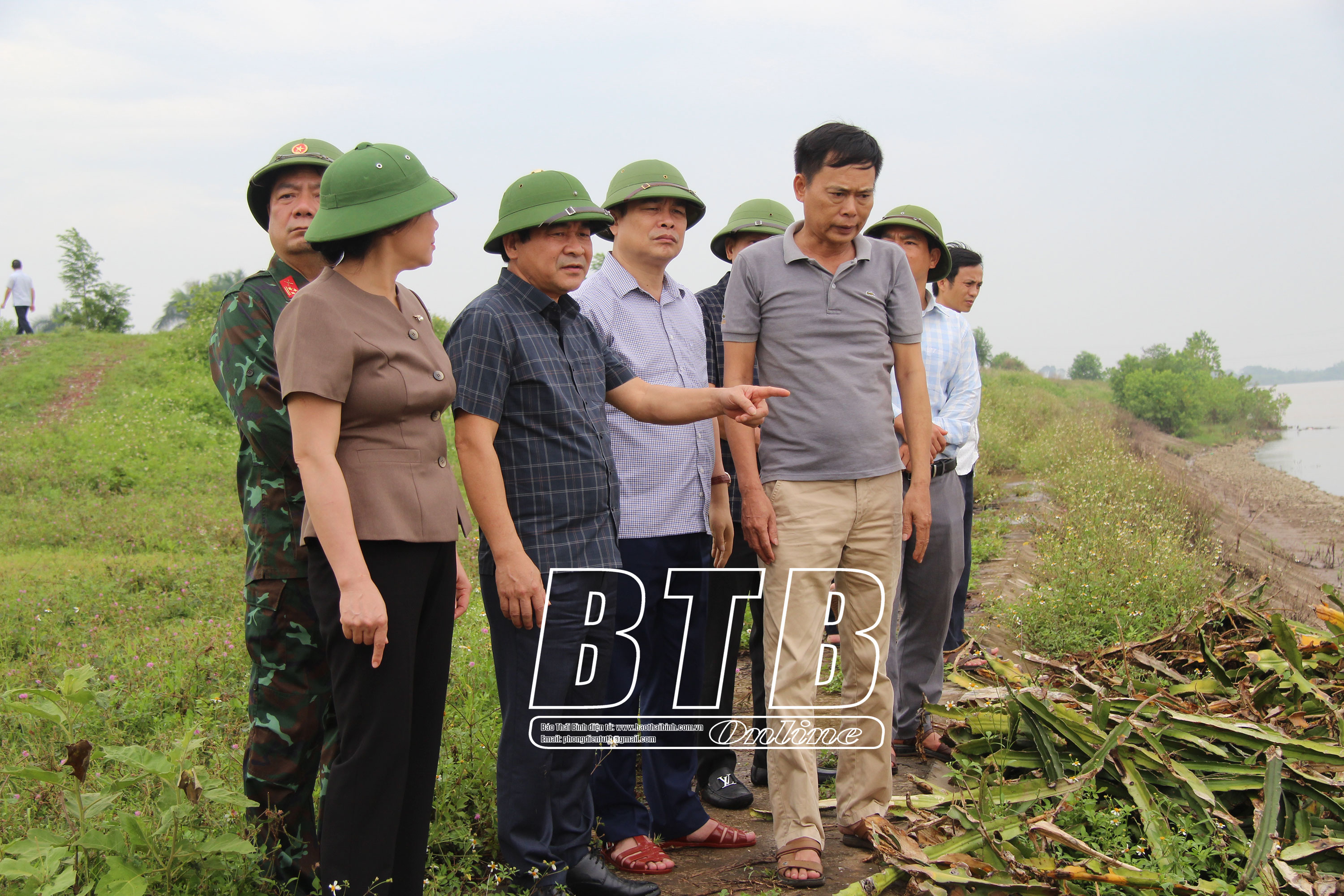 Các đồng chí lãnh đạo tỉnh và huyện Vũ Thư kiểm tra công tác phòng, chống bão số 3 tại đê Hữu Lộc, xã Xuân Hòa.