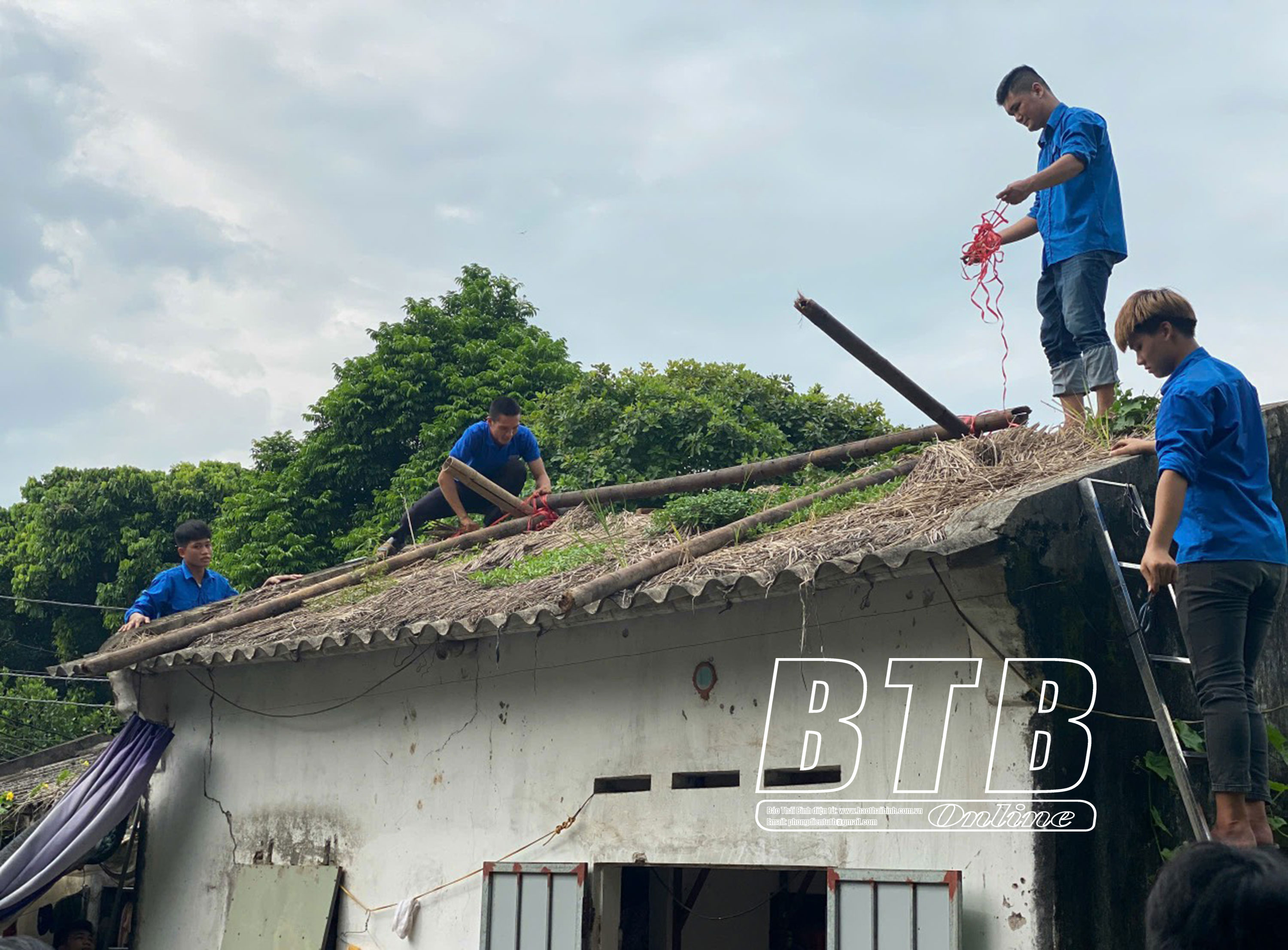 Thanh niên xã Trọng Quan (Đông Hưng) giúp gia đình khó khăn chằng chống nhà cửa ứng phó với bão số 3. Ảnh: Phương Chi
