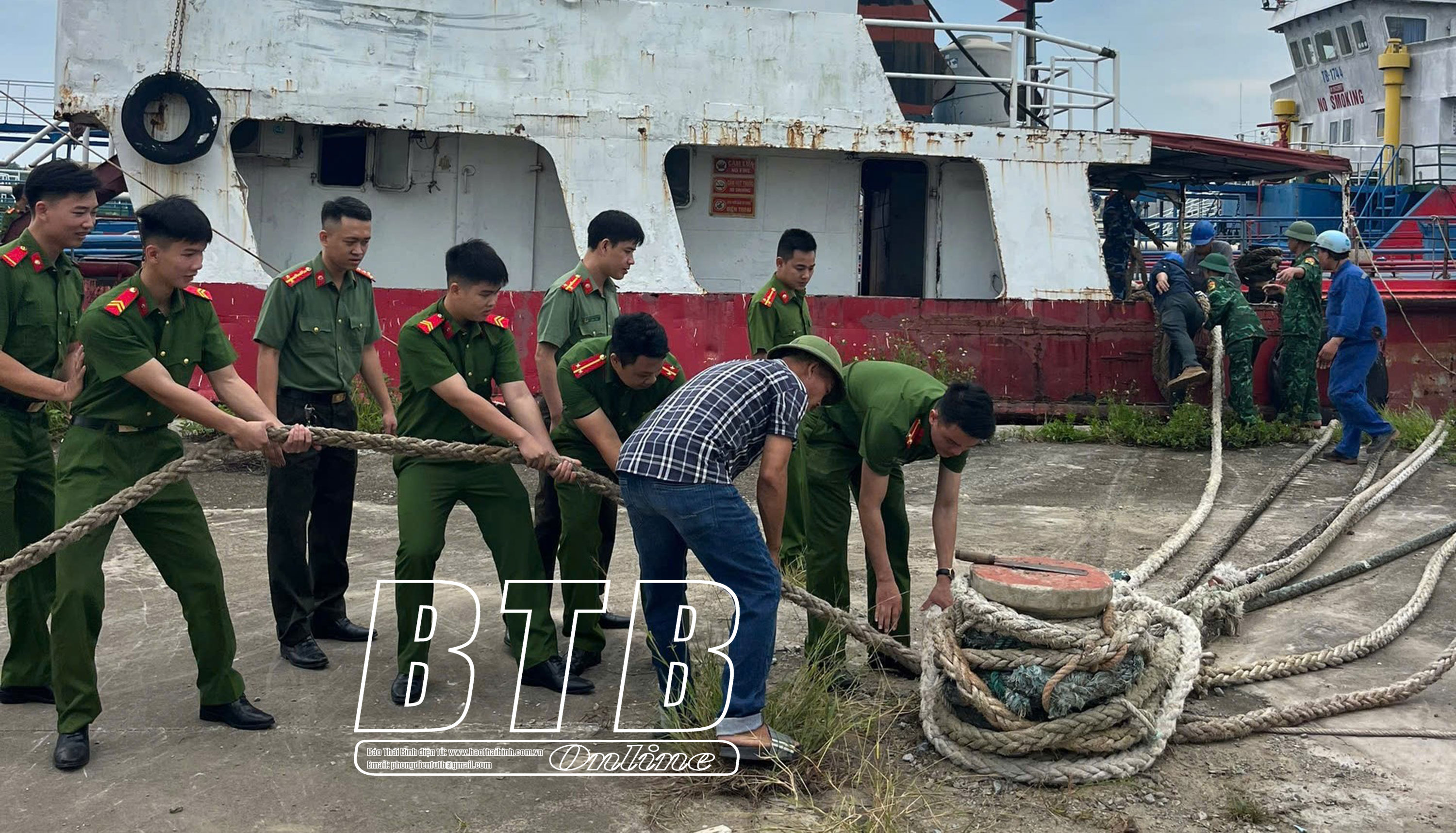 Công an huyện Thái Thụy giúp người dân chằng buộc tàu thuyền tránh trú bão tại thị trấn Diêm Điền. Ảnh: Trịnh Cường