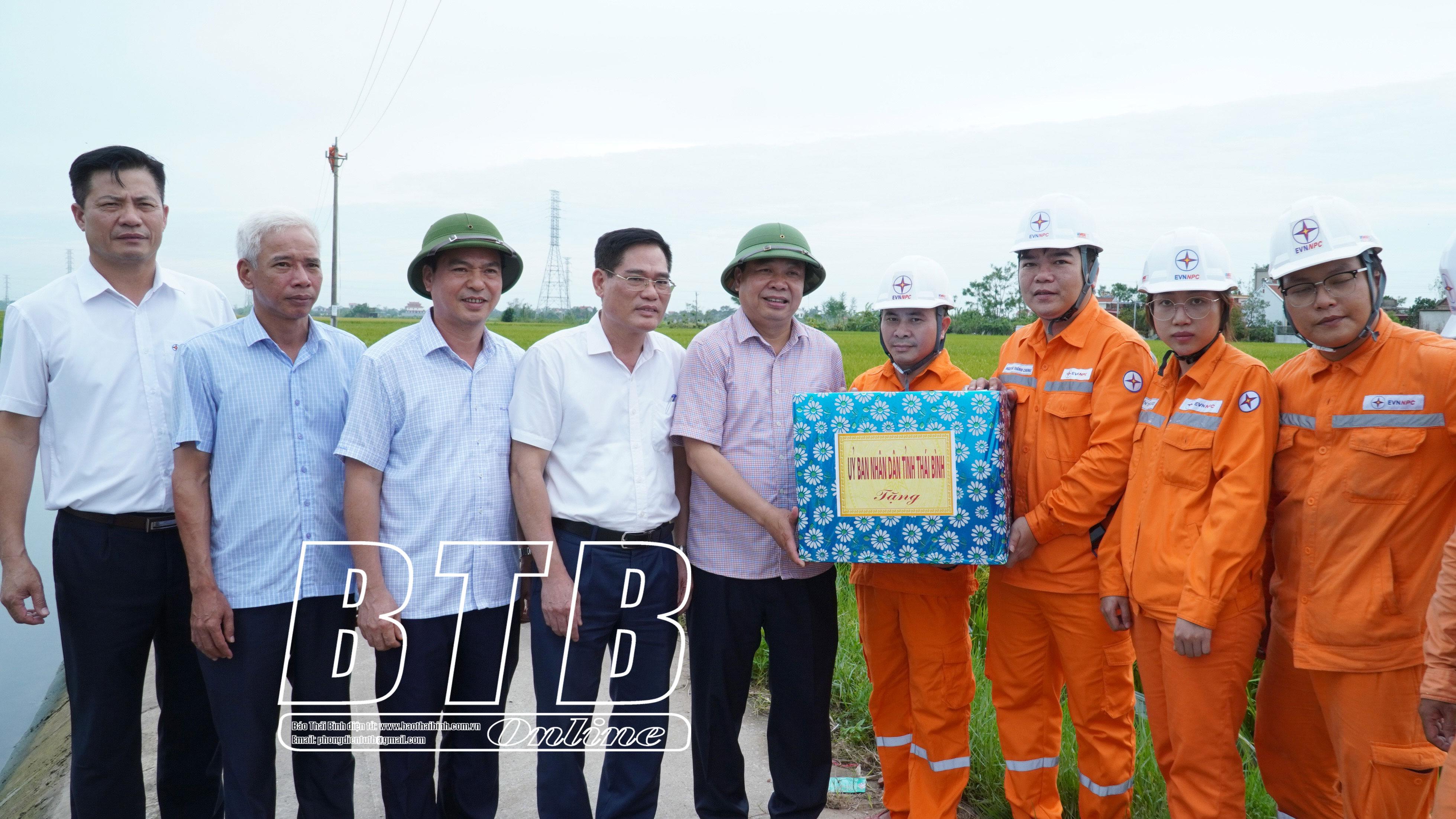 Thăm, tặng quà động viên cán bộ, công nhân Điện lực Thái Thụy đang khắc phục sự cố đường dây truyền tải điện trên địa bàn xã Hòa An, các đồng chí lãnh đạo tỉnh biểu dương các cán bộ, công nhân đang nỗ lực thi công dựng cột, đấu nối đường dây để sớm cấp điện trở lại cho người dân, doanh nghiệp sinh hoạt, khôi phục sản xuất, kinh doanh. các đồng chí đề nghị Công ty Điện lực Thái Bình, Điện lực Thái Thụy tập trung toàn bộ nhân lực, vật tư, phương tiện, quan tâm, hỗ trợ, cung cấp hậu cần bảo đảm sức khỏe cho công nhân, kịp thời có cơ chế động viên khích lệ anh em công nhân thi đua lao động để sớm đóng điện thông tuyến toàn bộ lưới điện trên địa bàn tỉnh.