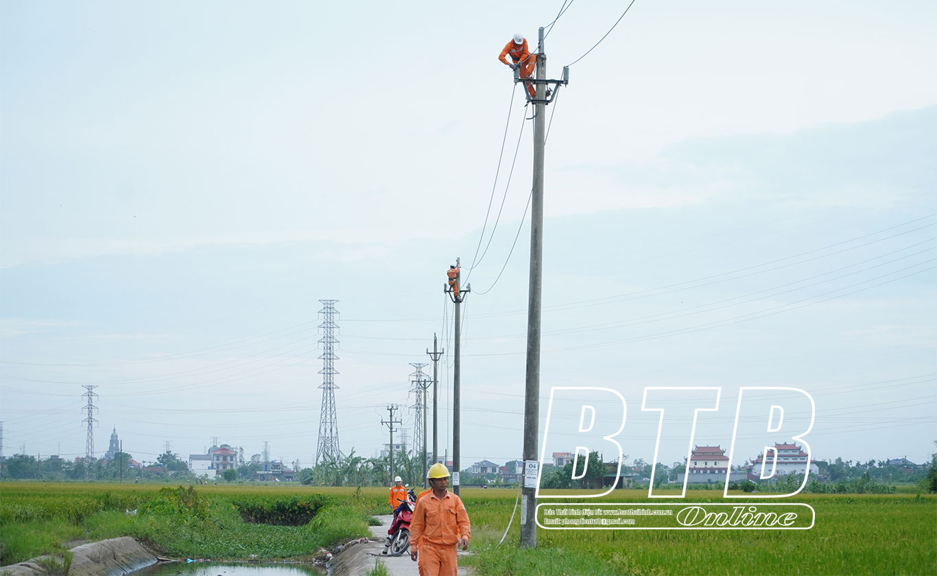 Các cán bộ, công nhân Điện lực Thái Thụy đang khắc phục sự cố đường dây tại xã Hòa An, huyện Thái Thụy.