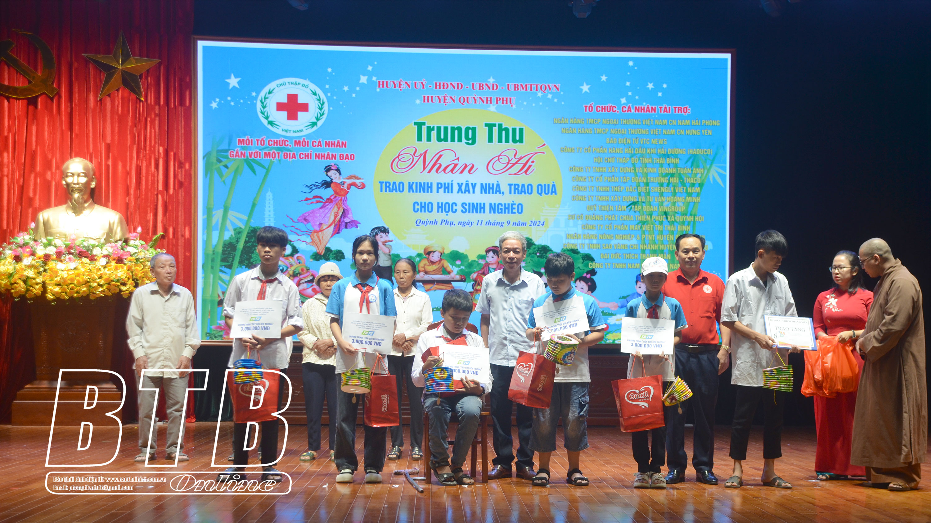 Sáng ngày 11/9, huyện Quỳnh Phụ tổ chức chương trình Trung thu nhân ái năm 2024, trao kinh phí xây nhà và tặng quà cho trẻ em có hoàn cảnh khó khăn trên địa bàn huyện.
