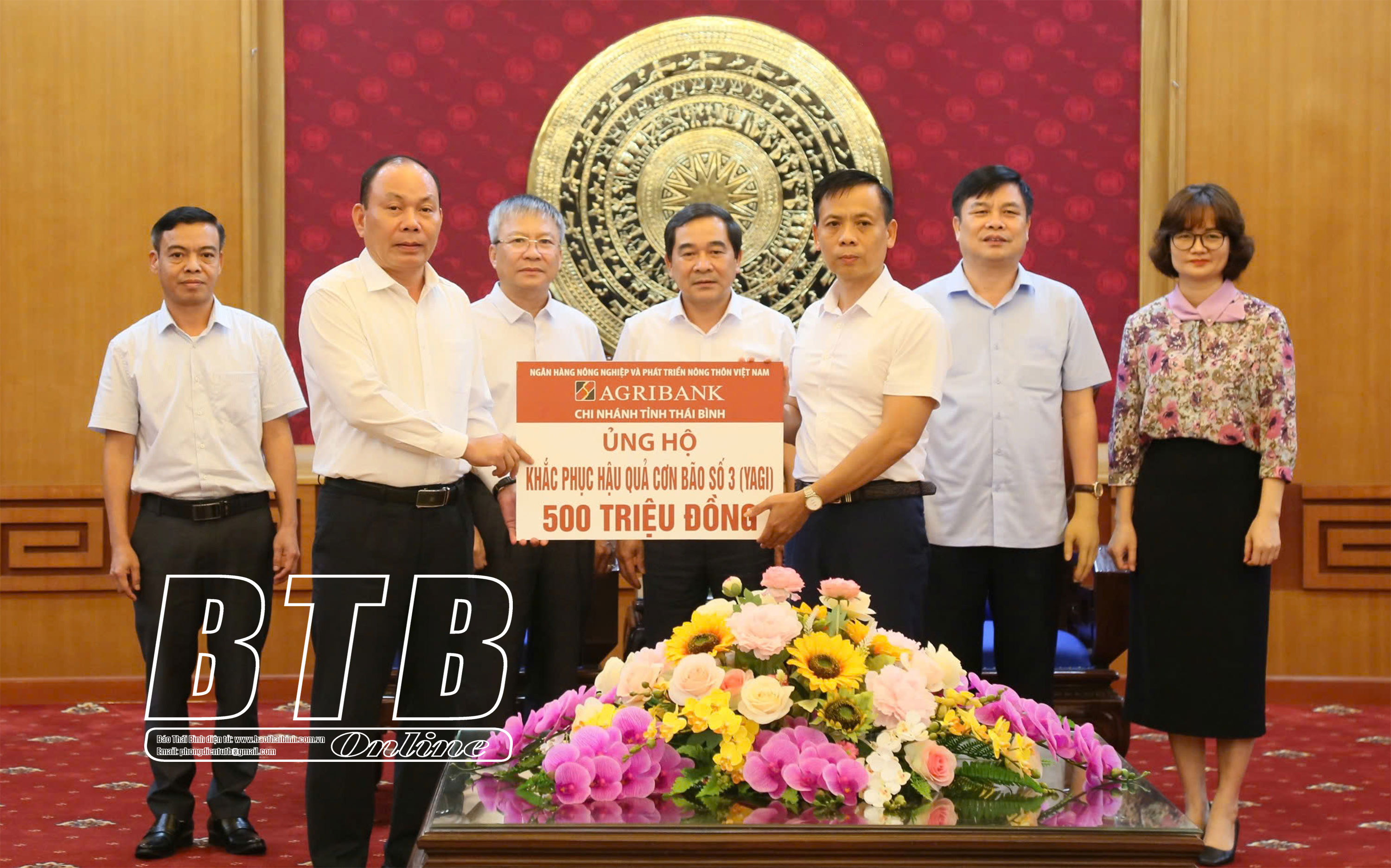 Cũng trong chiều nay, đại diện Ngân hàng Nông nghiệp và Phát triển nông thôn Việt Nam Chi nhánh tỉnh Thái Bình; Ngân hàng Nông nghiệp và Phát triển nông thôn Việt Nam Chi nhánh Bắc Thái Bình trao 500 triệu đồng/đơn vị để tỉnh khắc phục hậu quả bão số 3.