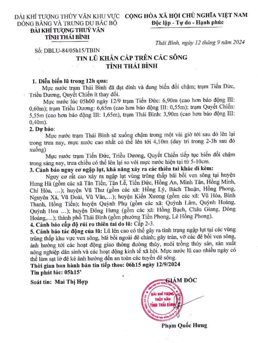 Tin lũ khẩn cấp trên các sông tỉnh Thái Bình