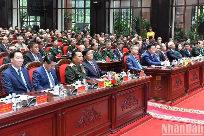 Tổng Bí thư, Chủ tịch nước Tô Lâm và Tổng Bí thư, Chủ tịch nước Lào Thongloun Sisoulith và các đại biểu tại buổi gặp mặt. (Ảnh: ĐĂNG KHOA-THỦY NGUYÊN).