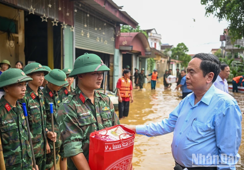 Chủ tịch Quốc hội Trần Thanh Mẫn thăm hỏi, tặng quà lực lượng làm nhiệm vụ khắc phục hậu quả mưa lũ tại xã Nga My, huyện Phú Bình.