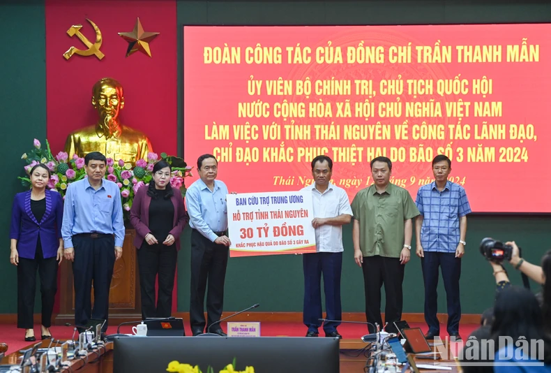 Chủ tịch Quốc hội Trần Thanh Mẫn trao hỗ trợ tỉnh Thái Nguyên 30 tỷ đồng khắc phục hậu quả bão số 3.