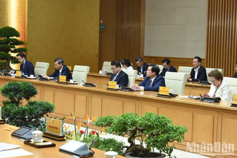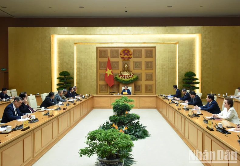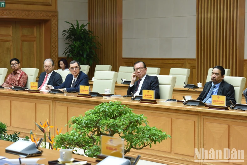 Thủ tướng Phạm Minh Chính và Đoàn các Chủ tịch Hội đồng Tư vấn kinh doanh ASEAN (ASEAN BAC) các nước do Chủ tịch ASEAN BAC năm 2024 Oudet Souvannavong dẫn đầu.
