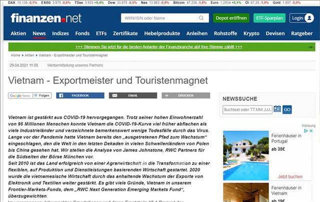 Ảnh chụp màn hình trang tin Finanzen.net viết về Việt Nam.