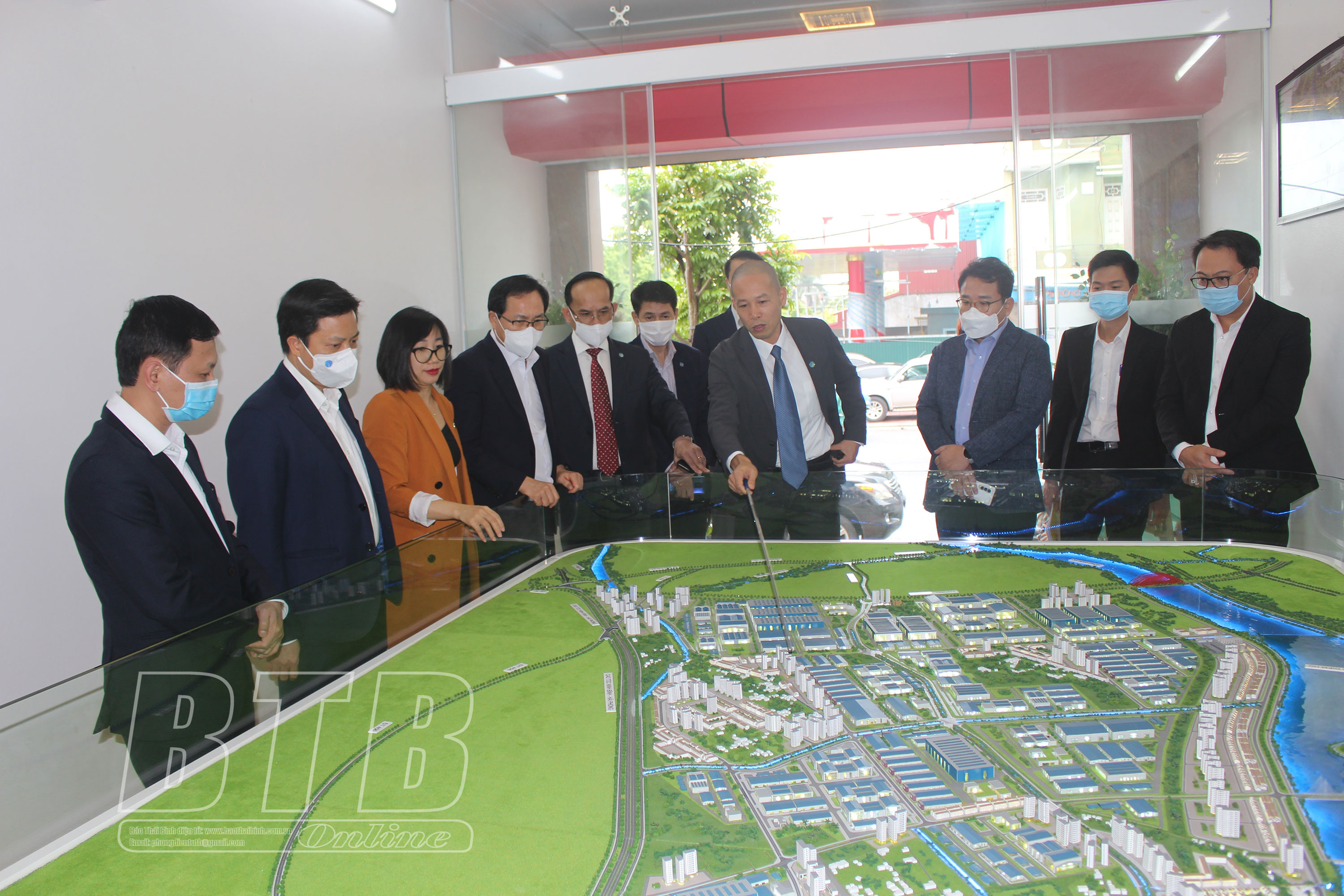 Lãnh đạo Công ty Cổ phần Green I-Park giới thiệu về quy mô và các hạng mục của Khu công nghiệp Liên Hà Thái (Thái Thụy). Ảnh: Minh Hương