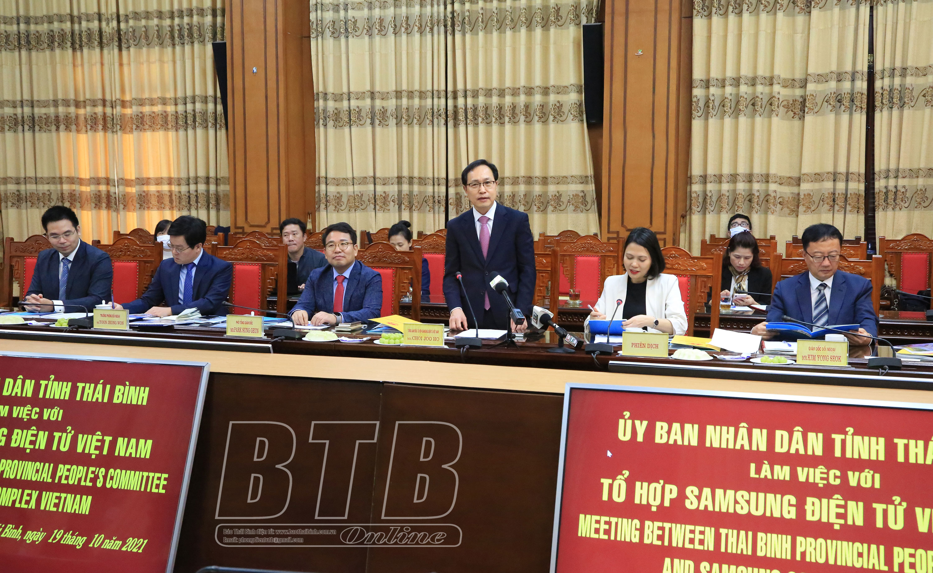 Giới thiệu về Tập đoàn Samsung, ông Choi Joo Ho, Tổng giám đốc Tổ hợp Samsung Việt Nam cho biết: Sau 13 năm, khởi đầu với mức đầu tư 670 triệu USD đến nay, tổng vốn đầu tư của Samsung tại Việt Nam đã lên tới 17,7 tỷ USD, tăng gấp hơn 26 lần so với ngày đầu thành lập. Hiện tại, Tổ hợp Samsung Việt Nam có 6 nhà máy (tại Bắc Ninh, Thái Nguyên, Thành phố Hồ Chí Minh), 1 Trung tâm Nghiên cứu và Phát triển tại Hà Nội, 1 pháp nhân bán hàng; tạo việc làm cho 110.000 lao động; tổng kim ngạch xuất khẩu năm 2020 đạt 56,5 tỷ USD, chiếm 20% tổng kim ngạch xuất khẩu của Việt Nam. Năm 2021, Tổ hợp Samsung Việt Nam phấn đấu kim ngạch xuất khẩu tăng 10% so với năm 2020. Để nâng tầm năng lực nghiên cứu và chất lượng kỹ sư, Tổ hợp Samsung Việt Nam đang xây dựng mới Trung tâm Nghiên cứu và Phát triển với quy mô lớn nhất Đông Nam Á tại Hà Nội và dự kiến sẽ hoàn thành vào cuối năm 2022. Trên cơ sở buổi thăm và làm việc của Tổ hợp Samsung Việt Nam tại Thái Bình, ông Choi Joo Ho cũng cam kết sẽ giới thiệu các doanh nghiệp Hàn Quốc có nhu cầu đầu tư vào Việt Nam về đầu tư tại Thái Bình.