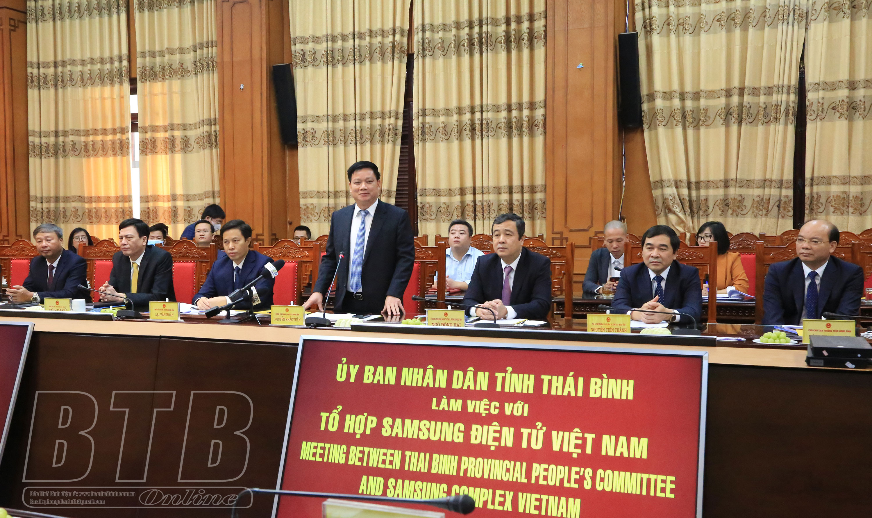 Phát biểu chào mừng, đồng chí Nguyễn Khắc Thận, Phó Bí thư Tỉnh ủy, Chủ tịch UBND tỉnh khẳng định: Cuộc đến thăm, làm việc của Tổ hợp Samsung Việt Nam có ý nghĩa hết sức quan trọng và thiết thực đối với tỉnh Thái Bình, khẳng định quyết tâm mở rộng hợp tác, thu hút đầu tư của tỉnh và cũng thể hiện sự quan tâm của các nhà đầu tư đến môi trường đầu tư của Thái Bình. Đồng chí cũng giới thiệu khái quát về tiềm năng, lợi thế của tỉnh, những kết quả nổi bật trong phát triển kinh tế - xã hội của tỉnh đặc biệt là công tác thu hút đầu tư vào tỉnh. Với nhiều lợi thế về vị trí địa lý, nguồn nhân lực dồi dào, hệ thống giao thông được quan tâm đầu tư hiện đại và Khu kinh tế Thái Bình được phê duyệt quy hoạch chung với tổng diện tích hơn 30.583ha, Thái Bình đã thu hút được nhiều doanh nghiệp trong và ngoài nước đến tìm hiểu, trong đó có một số doanh nghiệp đã tin tưởng đầu tư nhà máy sản xuất, kinh doanh. 9 tháng năm 2021, mặc dù trong bối cảnh chịu tác động của dịch Covid-19, Thái Bình thu hút được tổng vốn đầu tư đăng ký 16.805 tỷ đồng (tương đương 730 triệu USD), tăng khoảng 4,5 lần so với cùng kỳ 2020, trong đó có một số dự án lớn như: dự án của Công ty TNHH Greenworks Việt Nam 200 triệu USD, dự án của Công ty TNHH Lotes Việt Nam 120 triệu USD, dự án của Công ty Jeanson Industrial Limited 75 triệu USD.