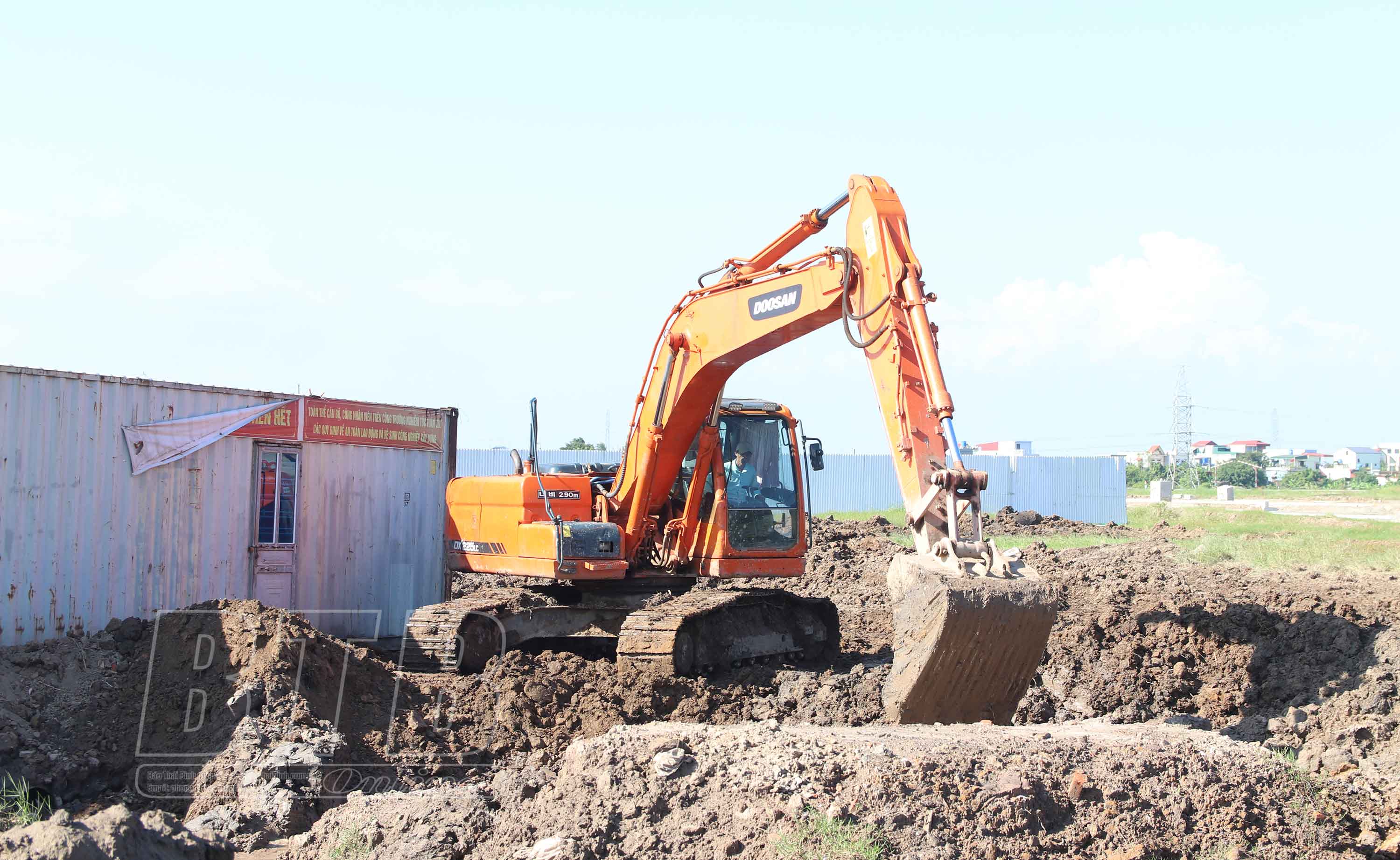 Đơn vị thi công đang đào đắp nền đường tuyến đường trục ngang phía Bắc Khu kinh tế Thái Bình, đoạn qua khu công nghiệp - dịch vụ Liên Hà Thái.