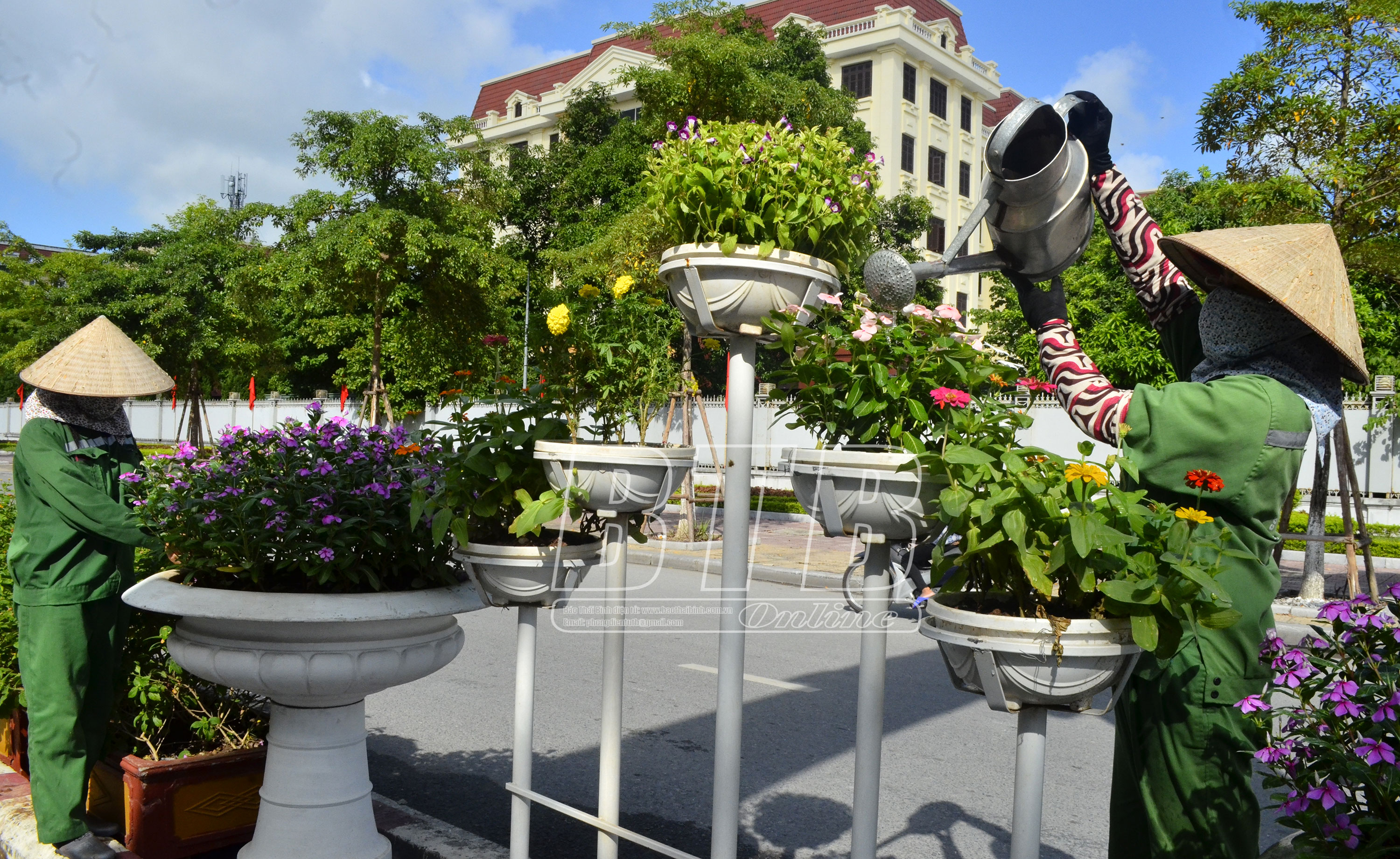 Công nhân Công ty Cổ phần Môi trường và Công trình đô thị Thái Bình chăm sóc bồn hoa, cây cảnh trên các tuyến phố.