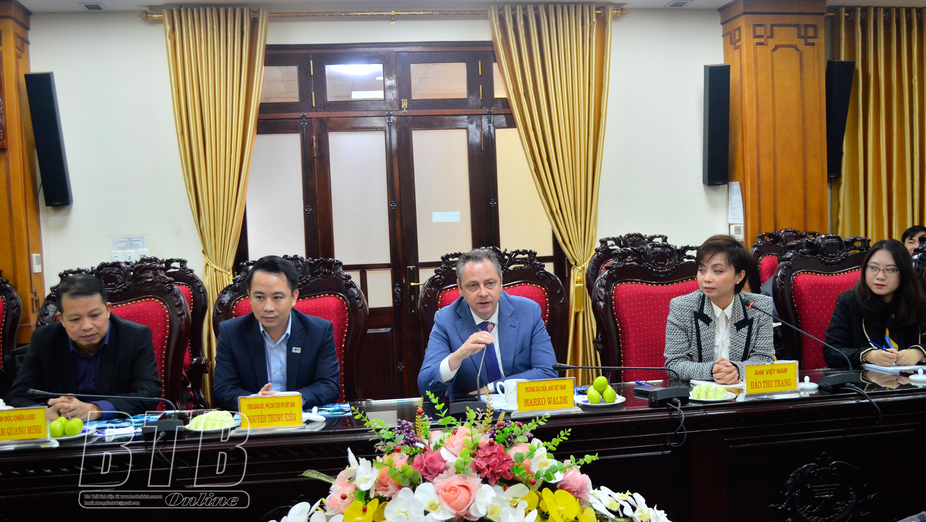 Ông Marko Walde, Trưởng đại diện Phòng Công nghiệp và Thương mại Đức tại Việt Nam bày tỏ ấn tượng với những thành tựu trong phát triển kinh tế - xã hội và thu hút đầu tư của tỉnh Thái Bình, đồng thời cho biết: Việt Nam đã ký kết với châu Âu các hiệp định thương mại tự do và đây chính là lợi thế của Thái Bình nói riêng và Việt Nam nói chung trong thu hút đầu tư. Đặc biệt, các doanh nghiệp Đức cũng đang rất quan tâm đầu tư về tỉnh. Vì vậy, buổi làm việc hôm nay sẽ giúp Phòng Công nghiệp và Thương mại Đức tại Việt Nam hiểu rõ hơn các tiềm năng, thế mạnh, những thông tin quan trọng của tỉnh Thái Bình để truyền đạt tới các doanh nghiệp Đức.