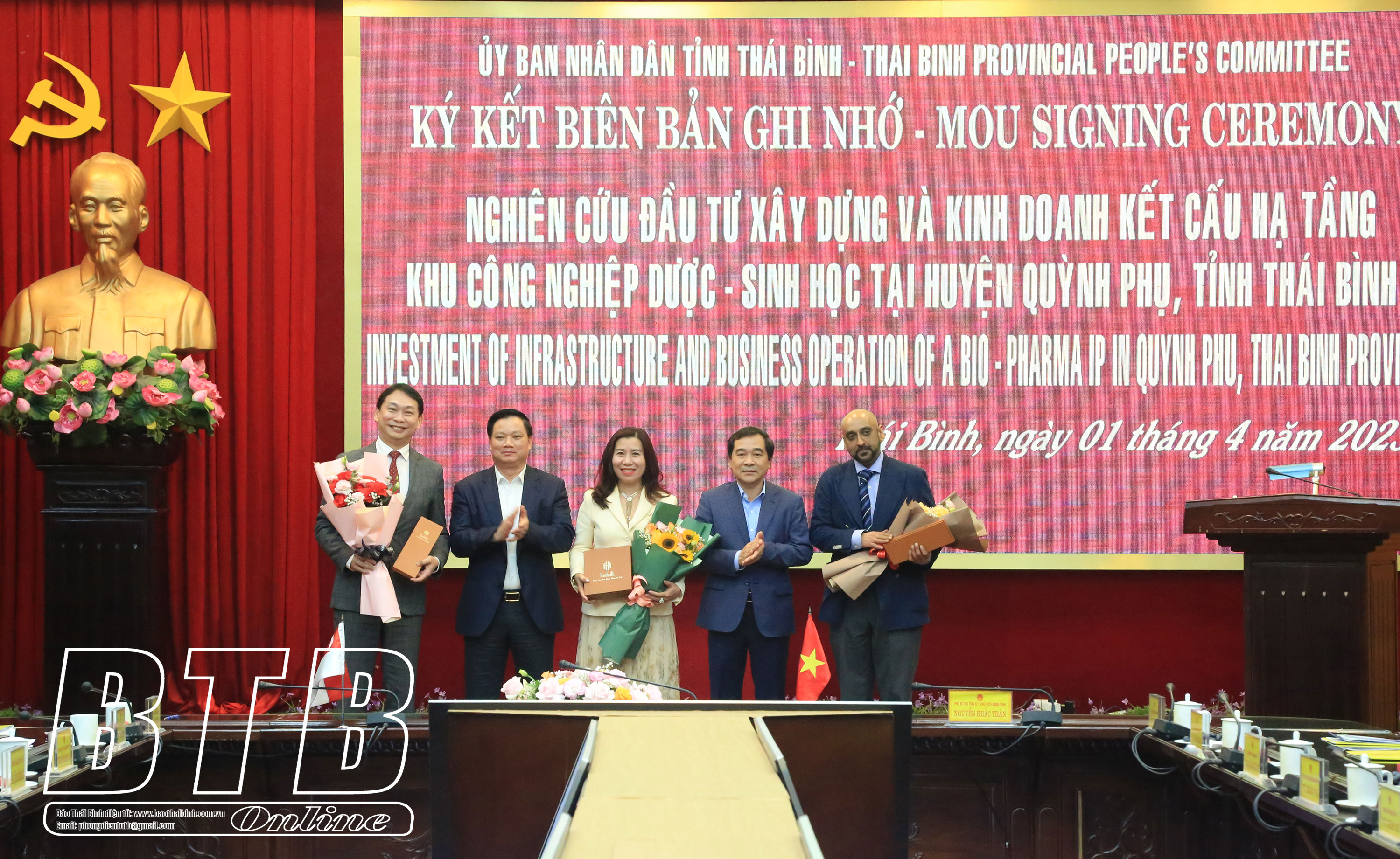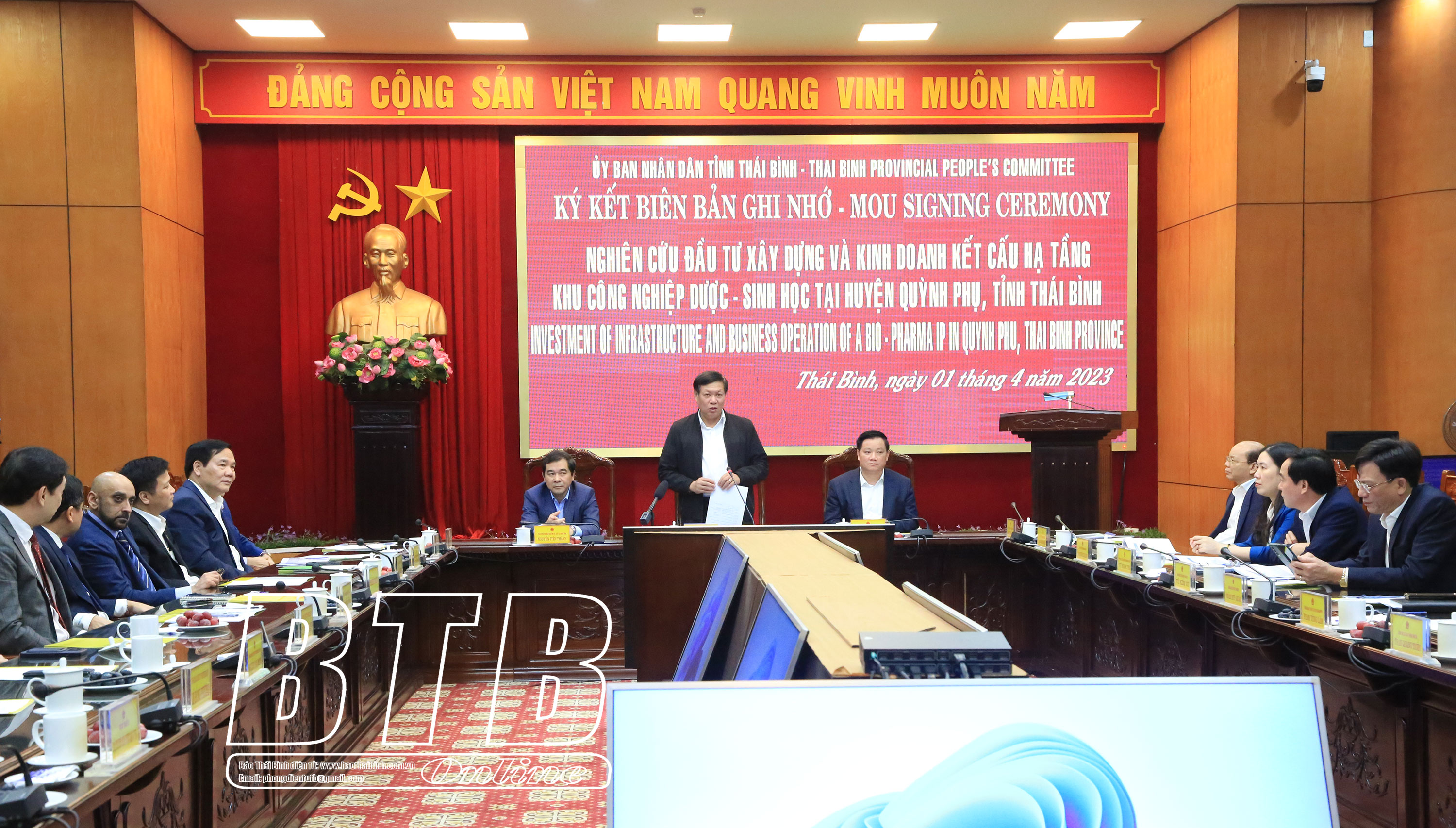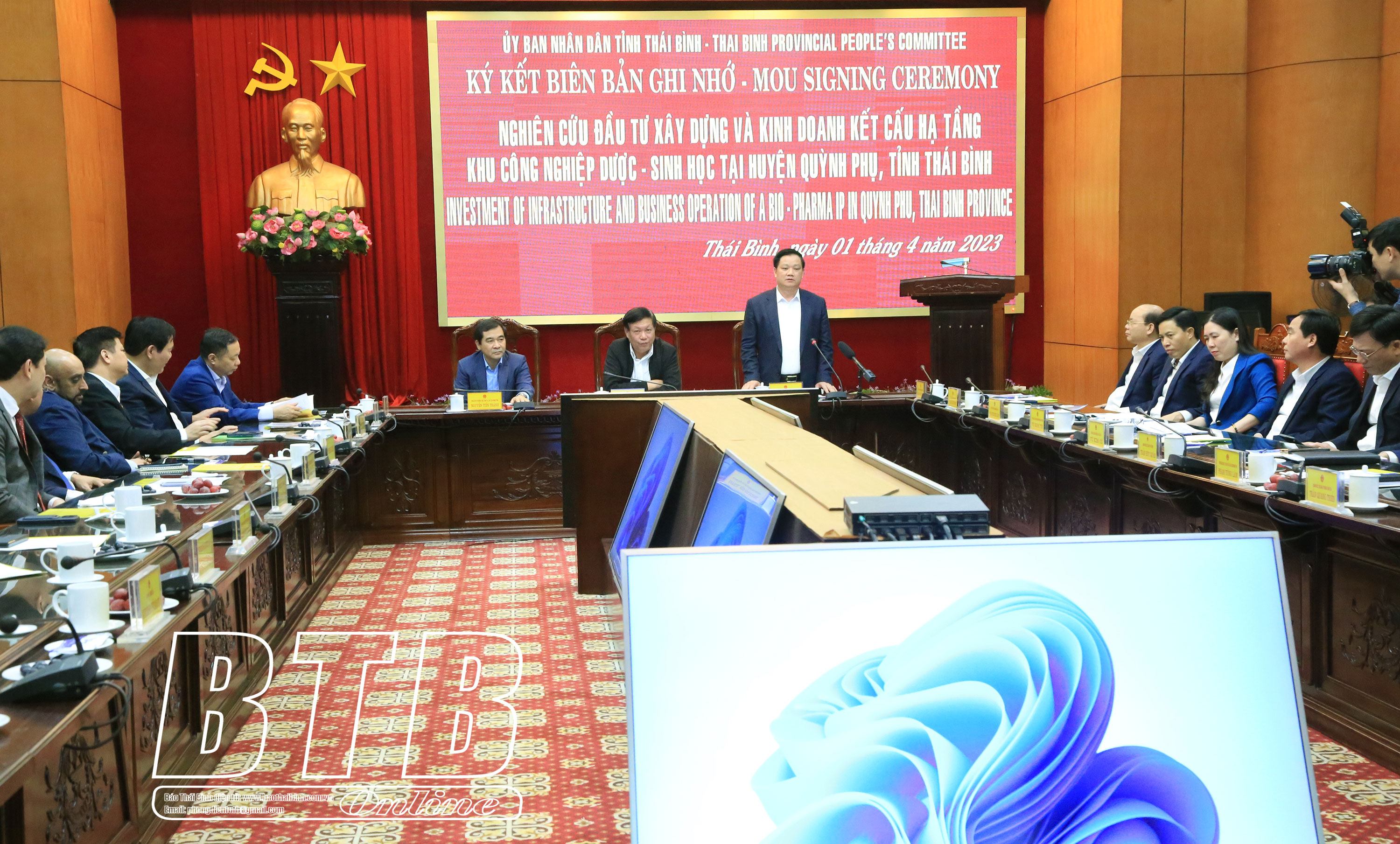 Tại buổi lễ, các đại biểu đã chứng kiến đại diện UBND tỉnh và liên danh các nhà đầu tư ký kết biên bản ghi nhớ về nghiên cứu đầu tư dự án xây dựng và kinh doanh kết cấu hạ tầng KCN Dược – Sinh học tại địa bàn huyện Quỳnh Phụ.