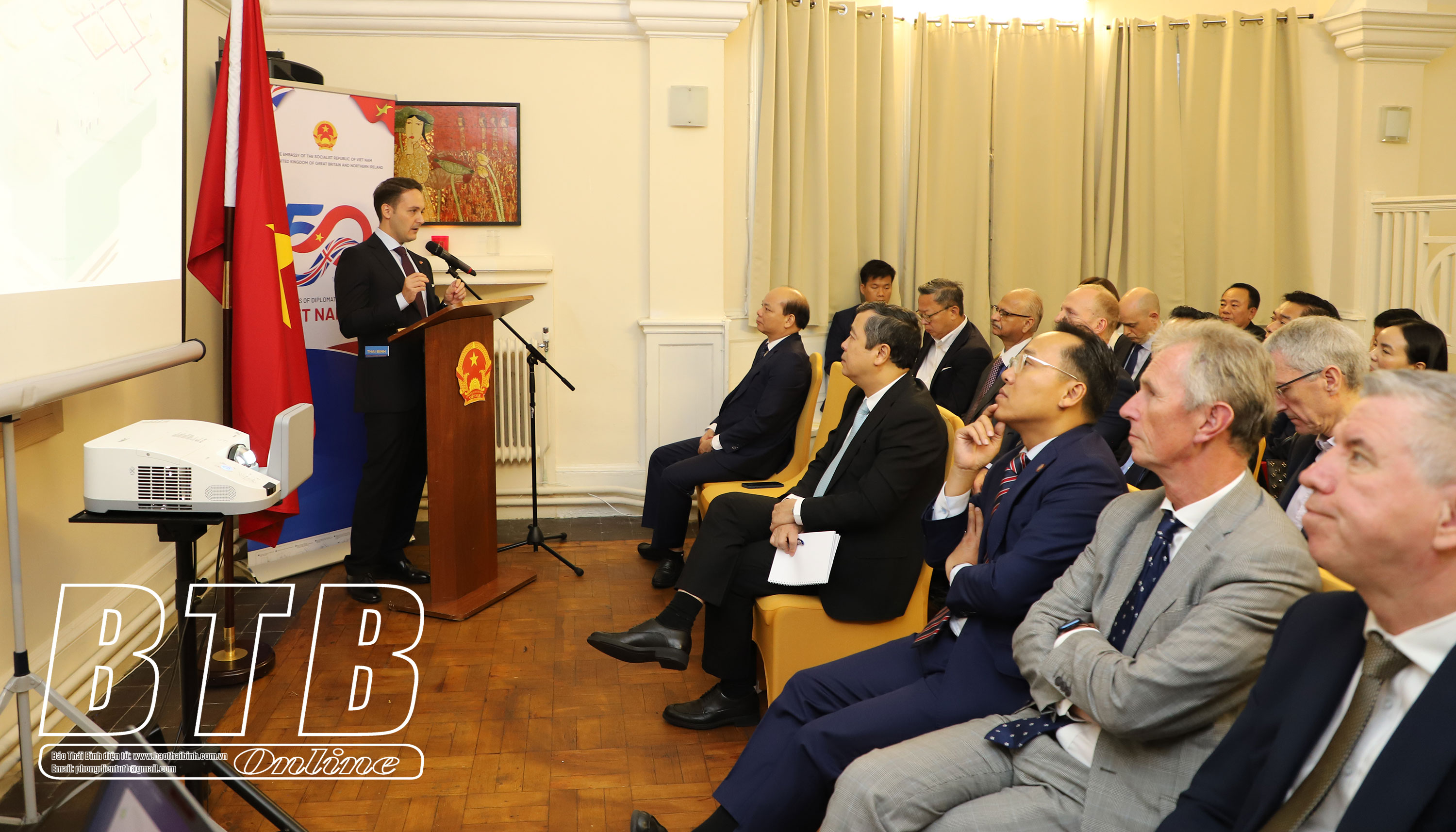 Giới thiệu về vị trí, vai trò, tiềm năng, thế mạnh và định hướng thu hút đầu tư của tỉnh, đồng chí Đặng Thanh Giang, Ủy viên Ban Thường vụ Tỉnh ủy, Phó Chủ tịch thường trực HĐND tỉnh thông tin: Thái Bình là tỉnh đồng bằng ven biển thuộc vùng Đông Bắc Việt Nam, cách Thủ đô Hà Nội hơn 100km; giáp Hải Phòng - thành phố cảng biển lớn của Việt Nam, cửa ngõ giao thương chính của Việt Nam và miền Bắc Việt Nam. Hệ thống giao thông kết nối của Thái Bình đến Hà Nội, Hải Phòng và các tỉnh rất thuận lợi. Thái Bình có khoảng 2 triệu dân, có nền kinh tế đang phát triển nhanh và nền văn hóa đa dạng, phong phú. Đặc biệt, Thái Bình có trên 1 triệu người trong độ tuổi lao động; người lao động có trình độ, tay nghề cao. Hiện nay, Thái Bình đang được Chính phủ định hướng phát triển nhanh thành tỉnh công nghiệp, thương mại và dịch vụ phát triển. Với việc thành lập Khu kinh tế Thái Bình có nhiều chính sách ưu đãi mạnh mẽ, lớn nhất của Việt Nam đối với các dự án đầu tư vào địa bàn và sự quyết liệt, đồng hành với nhà đầu tư của chính quyền tỉnh, Thái Bình đang vươn lên mạnh mẽ, trở thành điểm đến đầu tư hấp dẫn bậc nhất của các tỉnh phía Bắc Việt Nam. Tỉnh Thái Bình mong muốn được hợp tác toàn diện, trên nhiều lĩnh vực với các nhà đầu tư, trong đó có việc trao đổi, xuất nhập khẩu hàng hóa, văn hóa đồng thời tìm kiếm cơ hội hợp tác giáo dục, đào tạo, y tế và cơ hội tài trợ về nguồn lực tài chính. Với những lợi thế và khả năng phát triển của tỉnh trong bối cảnh Việt Nam đang phát triển mạnh mẽ, cùng với các cơ chế ưu đãi, Thái Bình mong muốn được tiếp đón các nhà đầu tư, các doanh nghiệp Vương quốc Anh đến nghiên cứu tìm hiểu cơ hội đầu tư tại tỉnh.