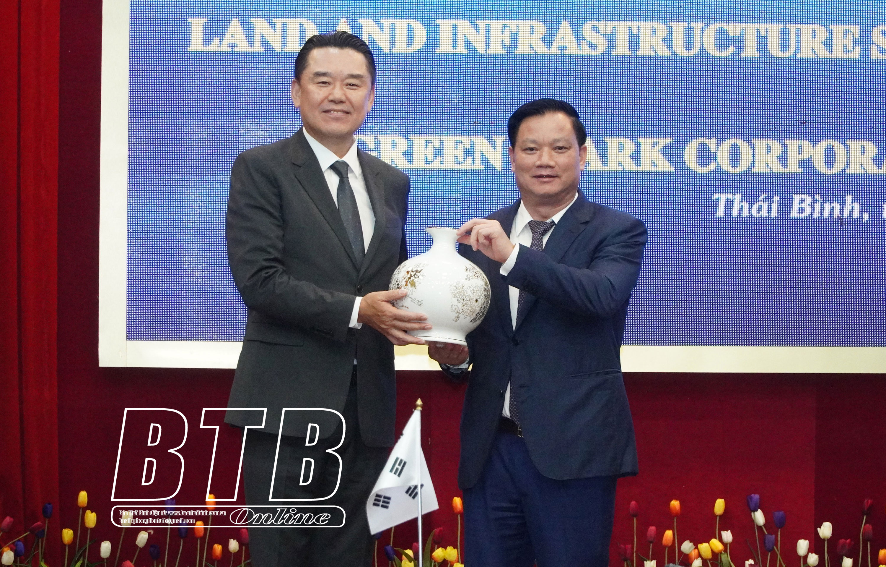 Đồng chí Nguyễn Khắc Thận, Phó Bí thư Tỉnh ủy, Chủ tịch UBND tỉnh tặng quà lưu niệm và chúc mừng Tập đoàn HiteJinro đến đầu tư hợp tác phát triển tại Thái Bình.