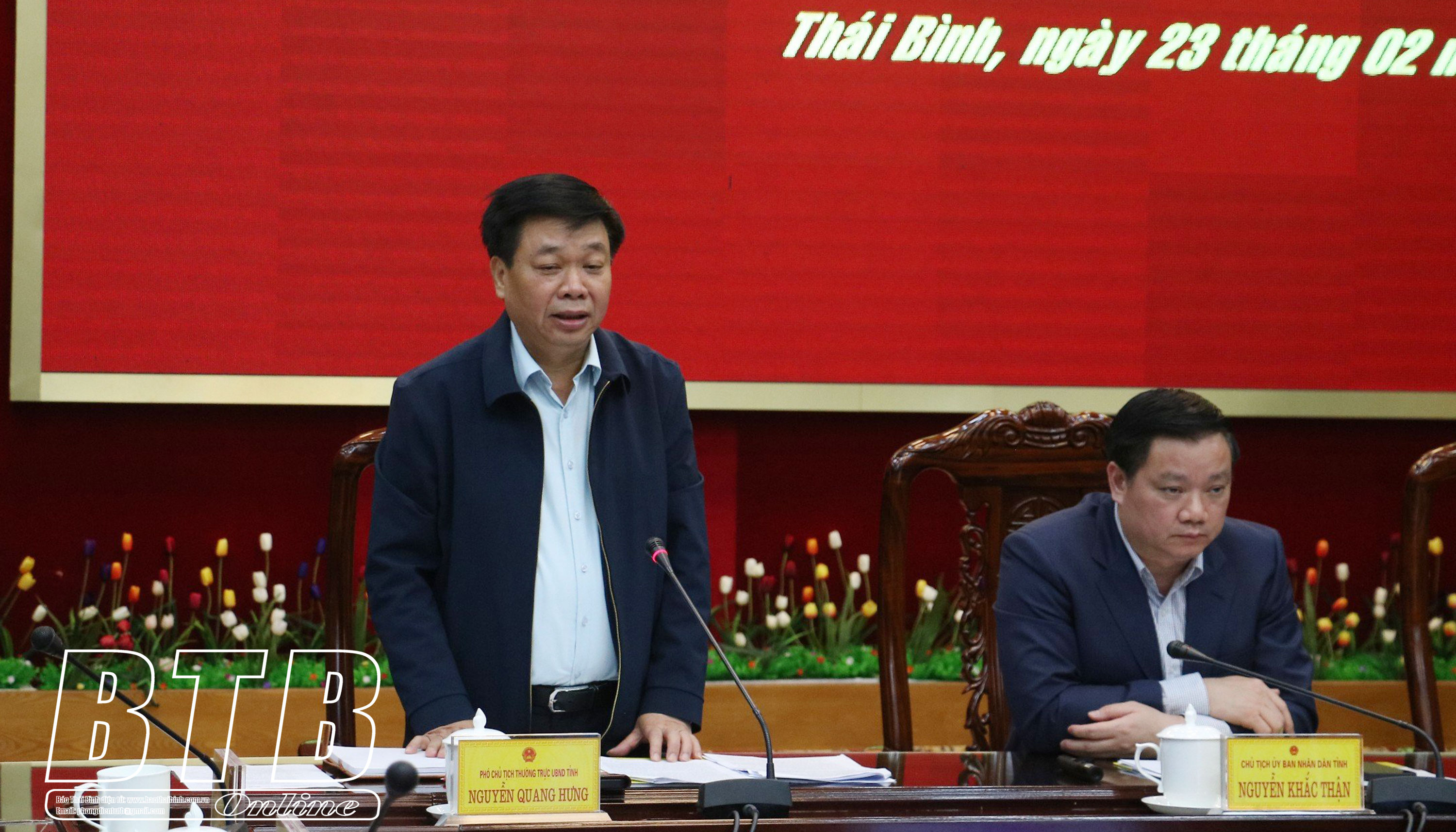 Đồng chí Nguyễn Quang Hưng, Ủy viên Ban Thường vụ Tỉnh ủy, Phó Chủ tịch thường trực UBND tỉnh phát biểu tại cuộc họp.