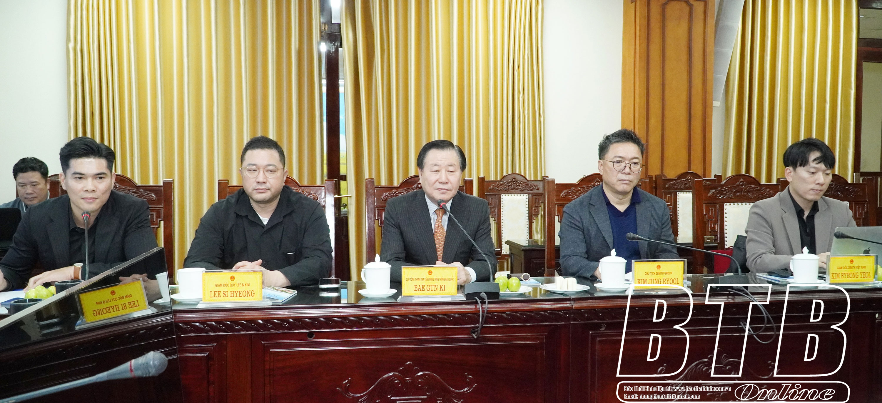 Dự buổi làm việc về phía đoàn Hàn Quốc có: ông Bae Gun Ki, cựu Tổng Thanh tra Văn phòng Tổng thống Hàn Quốc, Cố vấn Tập đoàn Zenith; ông Phạm Khắc Tuyên, Tham tán Thương mại Việt Nam tại Hàn Quốc; lãnh đạo Tập đoàn Zenith, Công ty Hankook Tire & Technology, Công ty DAS và Công ty GP Holdings.