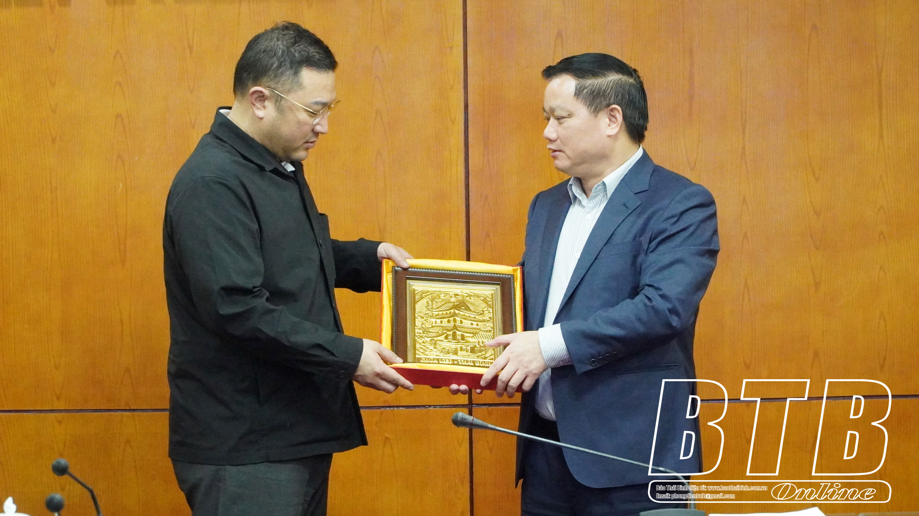 Đồng chí Phó Bí thư Tỉnh ủy, Chủ tịch UBND tỉnh tặng nhà đầu Hàn Quốc món quà hình ảnh biểu tượng của Thái Bình được làm bởi tài năng của người thợ thủ công trong tỉnh.
