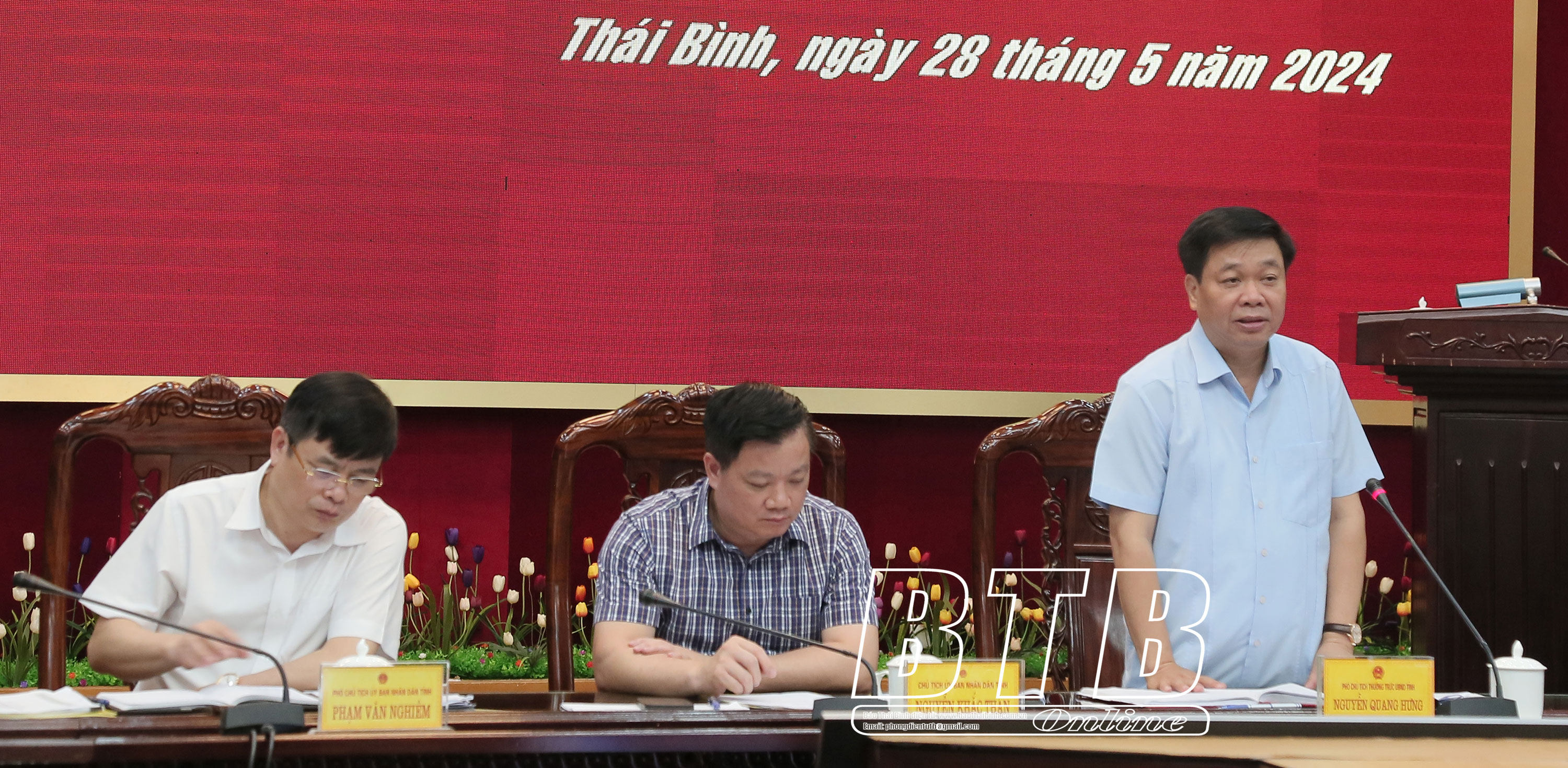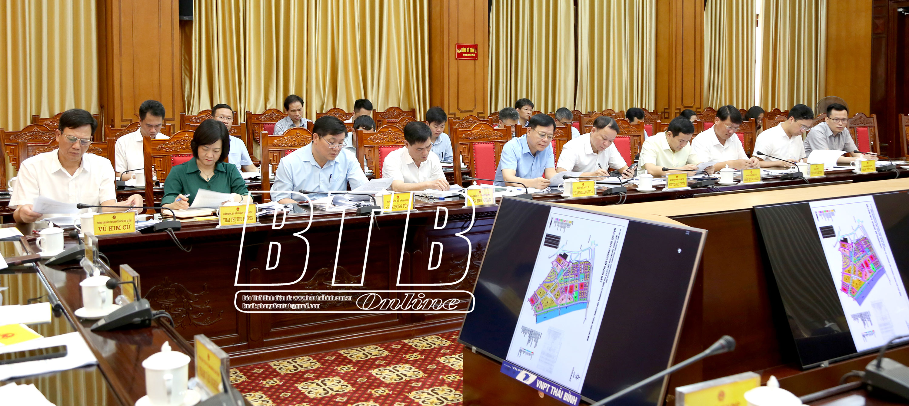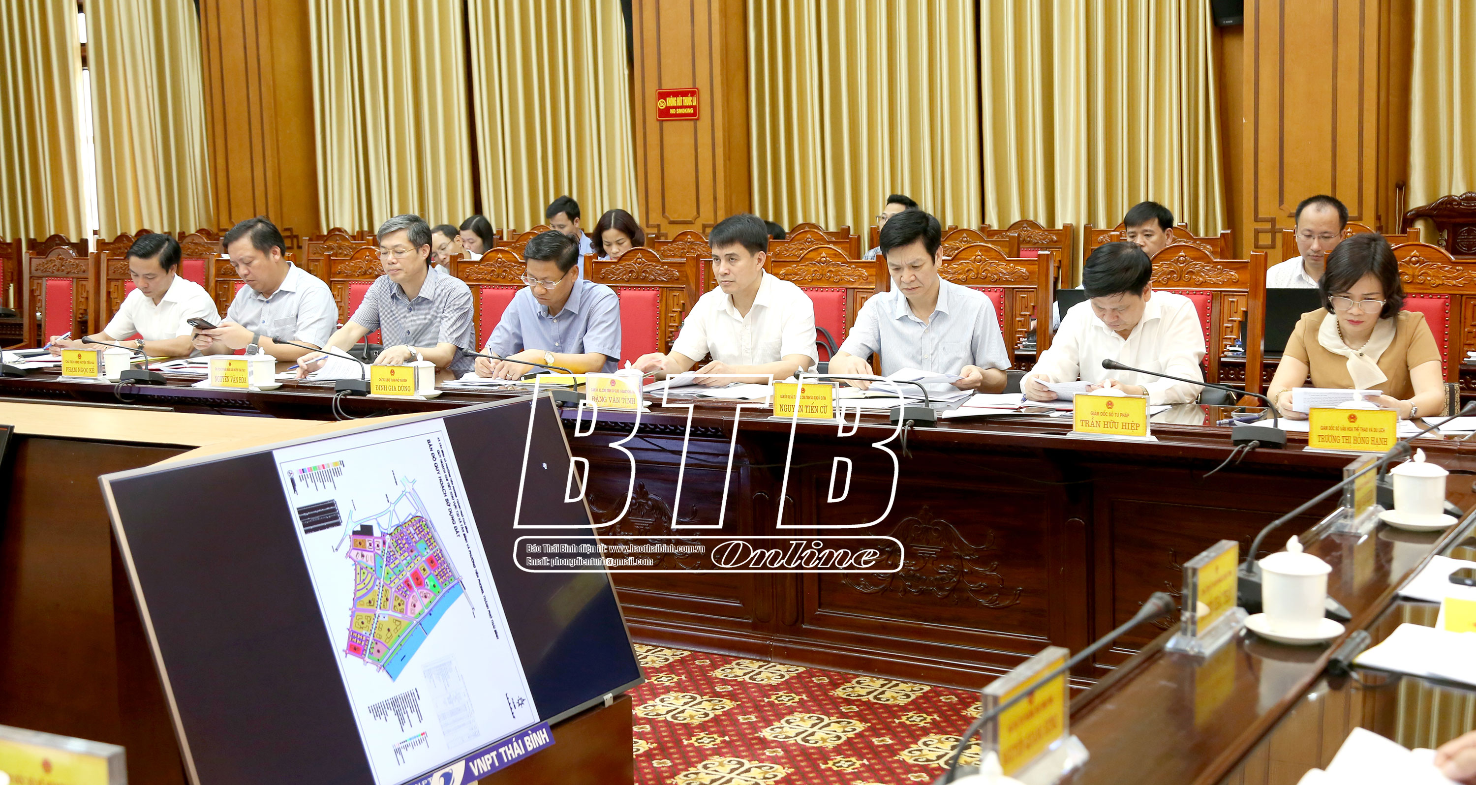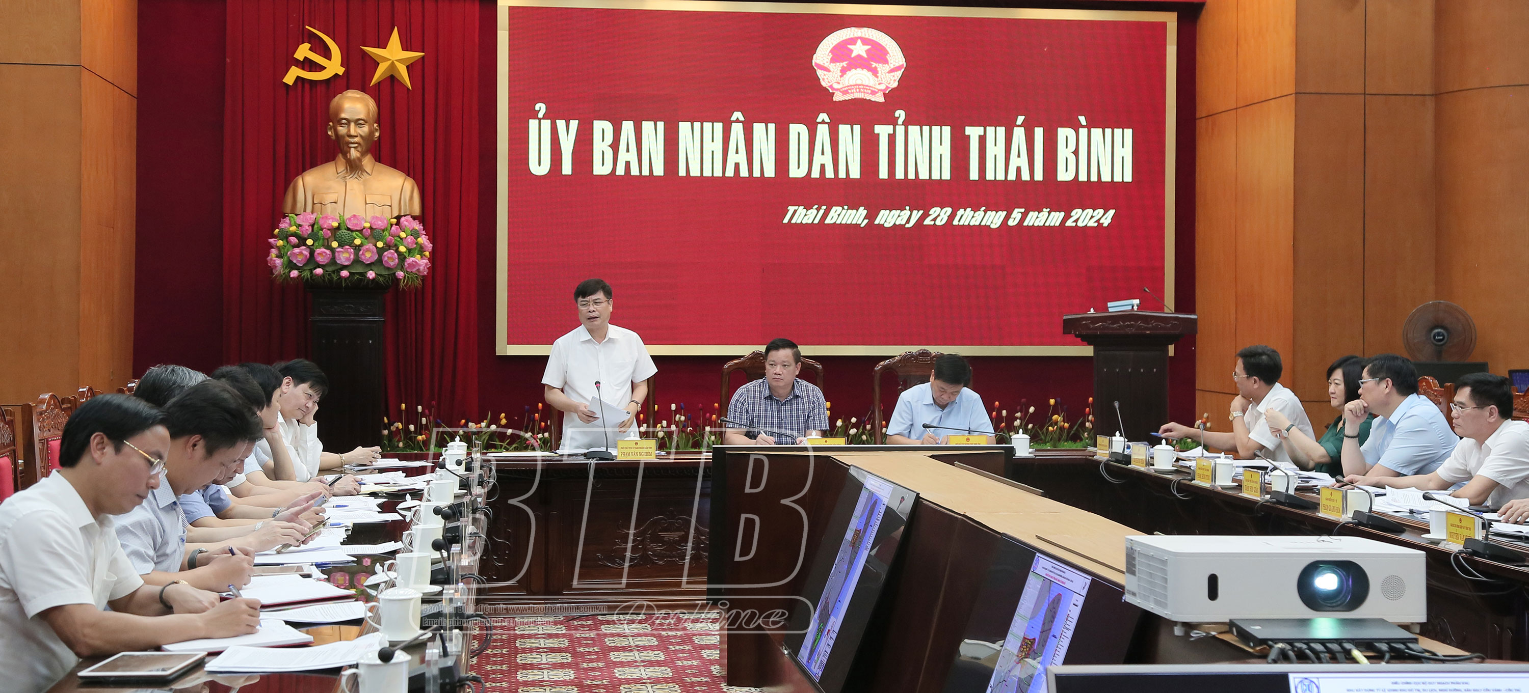 Lãnh đạo Văn phòng UBND tỉnh báo cáo tóm tắt về tiến độ triển khai thực hiện một số dự án gồm: Dự án phát triển nhà ở khu dân cư tại xã Đông Hòa (thành phố Thái Bình); dự án phát triển nhà ở khu đô thị mới tại xã Tân Bình và phường Tiền Phong (thành phố Thái Bình); dự án Bệnh viện Đa khoa tỉnh tại Khu trung tâm y tế; dự án đầu tư xây dựng Bảo tàng Thái Bình; dự án khu vực đô thị trung tâm ven sông Trà Lý tại phường Lê Hồng Phong (thành phố Thái Bình); dự án nâng cấp mở rộng đường Ngô Quyền và Đinh Tiên Hoàng (thành phố Thái Bình); dự án Nhà máy nhiệt điện LNG Thái Bình; quy hoạch xây dựng khu đô thị dịch vụ thương mại cao cấp cồn Vành - cồn Thủ (Tiền Hải); dự án sân golf cồn Vành(Tiền Hải); dự án đầu tư xây dựng và kinh doanh kết cấu hạ tầng khu công nghiệp VSIP Thái Bình (Thái Thụy); dự án đầu tư xây dựng tuyến đường bộ cao tốc Ninh Bình - Hải Phòng, đoạn qua tỉnh Nam Định và Thái Bình theo phương thức PPP.