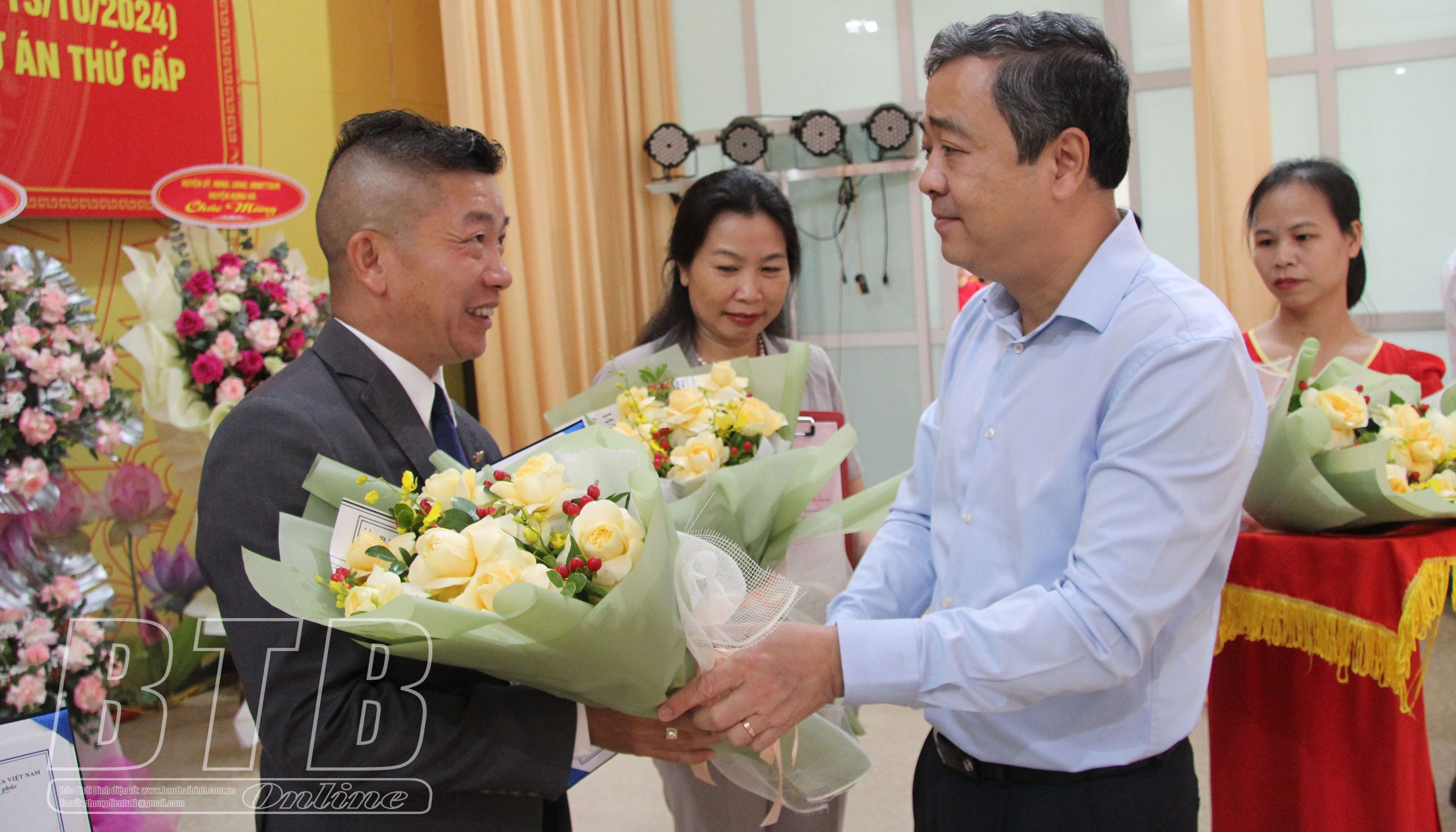 Đồng chí Ngô Đông Hải, Ủy viên Ban Chấp hành Trung ương Đảng, Bí thư Tỉnh ủy và đồng chí Nguyễn Quang Hưng, Ủy viên Ban Thường vụ Tỉnh ủy, Phó Chủ tịch thường trực UBND tỉnh tặng hoa chúc mừng các chủ đầu tư.