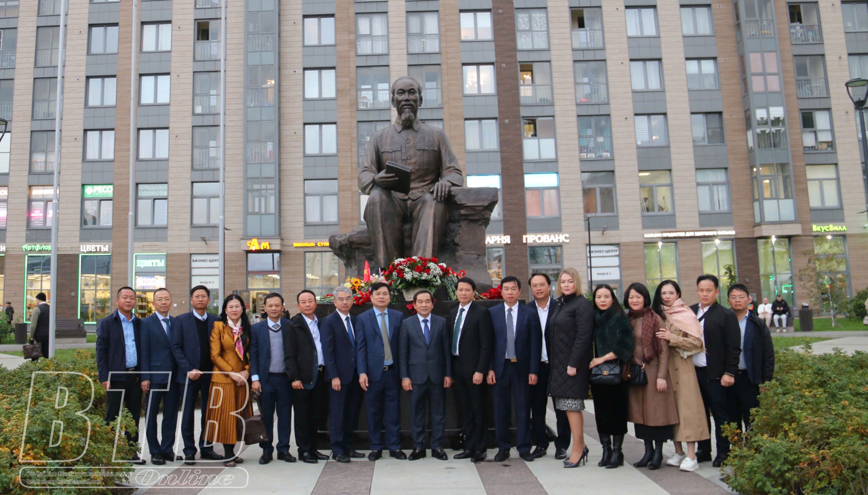 Đồng chí Nguyễn Tiến Thành, Phó Bí thư thường trực Tỉnh ủy, Chủ tịch HĐND tỉnh và thành viên đoàn công tác chụp ảnh lưu niệm tại Tượng đài Chủ tịch Hồ Chí Minh tại thành phố St. Petersburg.
