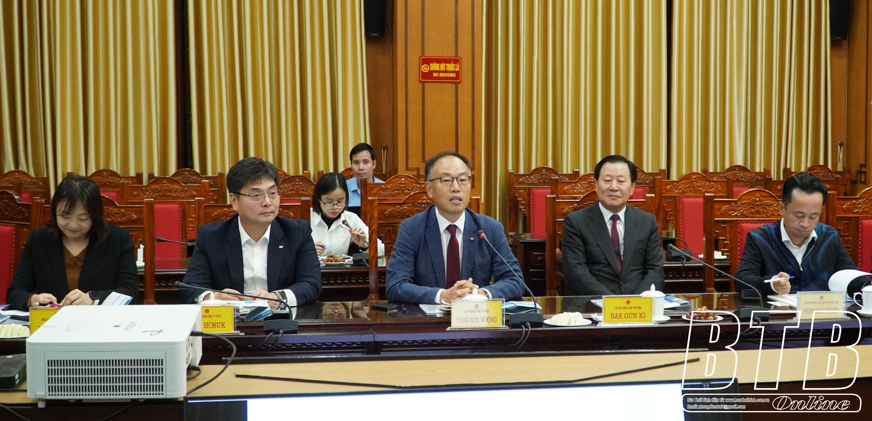 Chia sẻ về tình hình phát triển kinh tế - xã hội, kết quả thu hút đầu tư của tỉnh những năm gần đây, các đồng chí lãnh đạo tỉnh khẳng định, Thái Bình đang là điểm đến đầu tư hấp dẫn hàng đầu khu vực phía Bắc của các nhà đầu tư nước ngoài, trong đó có nhiều nhà đầu tư Hàn Quốc đã đầu tư và gặt hái được nhiều thành công; tỉnh hy vọng các bên có sự hợp tác cùng phát triển với những dự án cụ thể.