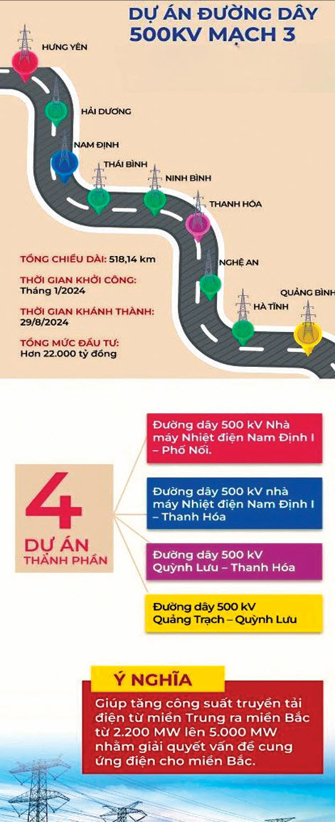 Đường dây 500kV mạch 3 Quảng Trạch - Phố Nối có tổng chiều dài 518,14km, với 1.177 vị trí cột, tổng mức đầu tư hơn 22.300 tỷ đồng. Dự án có khối lượng đào đất, đá hơn 2,5 triệu m3, sử dụng hơn 705.000m3 bê tông, gần 70.000 tấn cốt thép móng; tổng khối lượng lắp dựng cột thép 139.000 tấn; kéo tổng cộng gần 14.000km dây dẫn các loại. Đây là dự án trọng điểm, cấp bách, có ý nghĩa rất quan trọng, nâng cao năng lực truyền tải điện từ miền Trung ra miền Bắc với công suất từ 2.500MW lên 5.000MW, góp phần bảo đảm an ninh năng lượng quốc gia. Dự án được chỉ đạo trực tiếp, sát sao của Chính phủ, Thủ tướng Chính phủ, lãnh đạo các bộ, ban, ngành, chính quyền địa phương và sự đồng thuận của đông đảo nhân dân các nơi dự án đi qua. EVN, EVNNPT và các đơn vị nhà thầu thi công, tư vấn giám sát đã đồng sức, đồng lòng, nỗ lực triển khai với ý chí quyết tâm cao, tinh thần làm việc sáng tạo, quyết liệt.