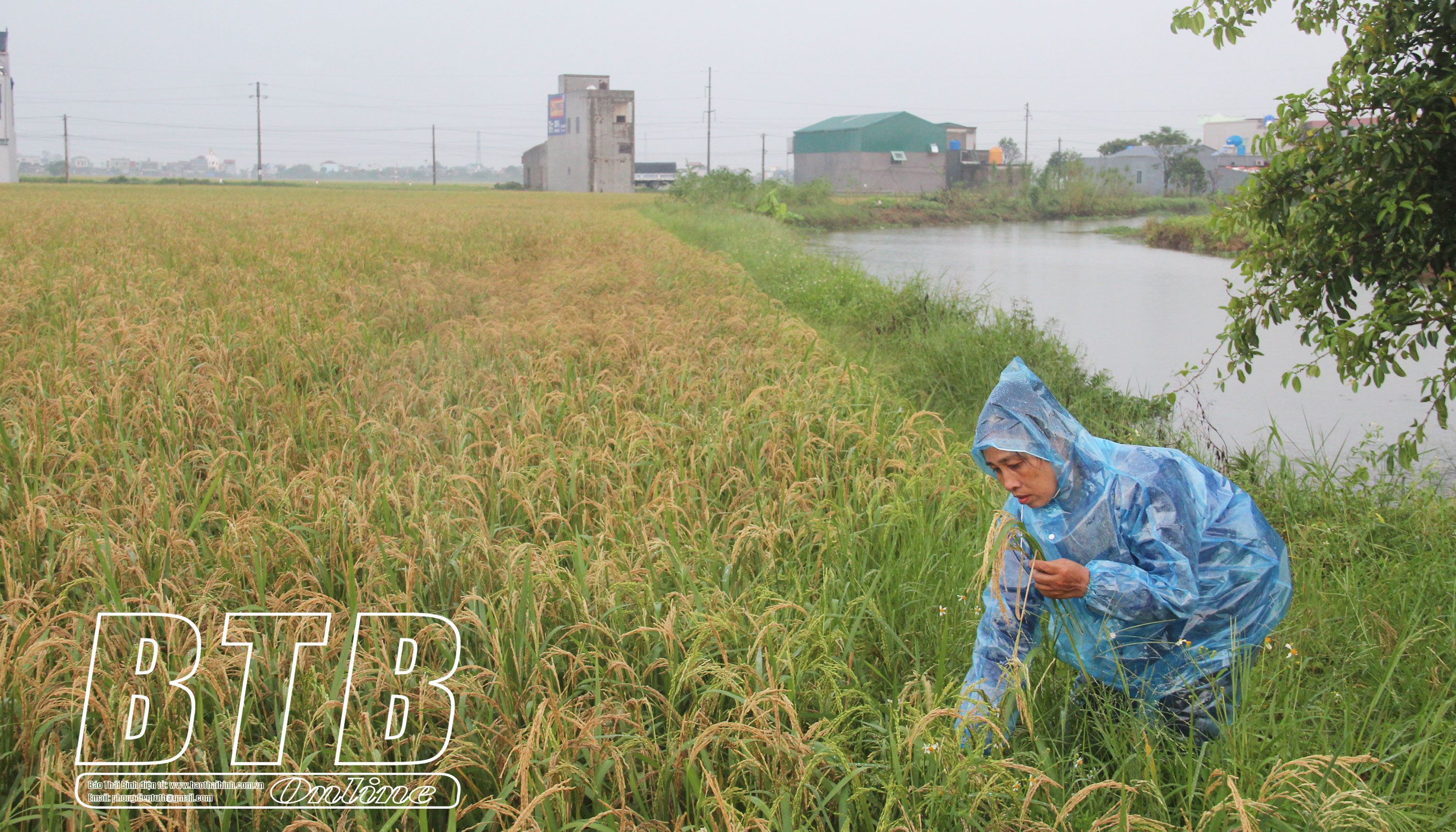 Cán bộ Trạm Trồng trọt và Bảo vệ thực vật huyện Đông Hưng kiểm tra diện tích lúa bị bạc bông tại xã Hà Giang.