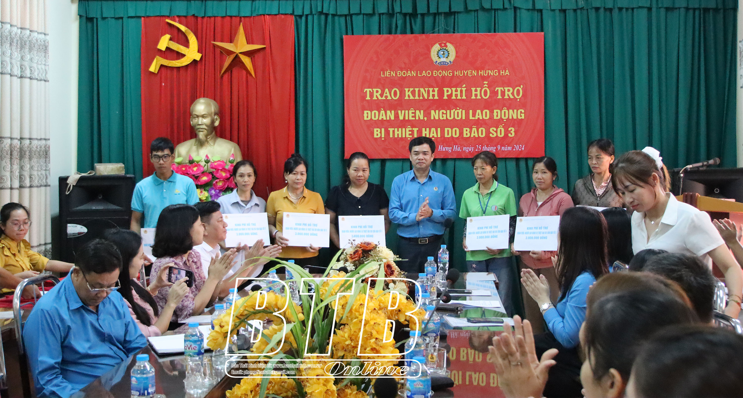 Đoàn đã đến thăm, trao 81 triệu đồng cho 51 đoàn viên, người lao động bị ảnh hưởng bởi bão số 3. Trong đó, 36 đoàn viên, người lao động phải tạm nghỉ việc dài ngày của Công ty TNHH Vật liệu và Xây dựng hạ tầng Hoa Cương, xã An Ninh (Quỳnh Phụ) được hỗ trợ 1 triệu đồng/người và 15 đoàn viên, người lao động có nhà bị tốc mái, đổ sập đang làm việc tại một số doanh nghiệp trên địa bàn huyện Hưng Hà được hỗ trợ 3 triệu đồng/người.