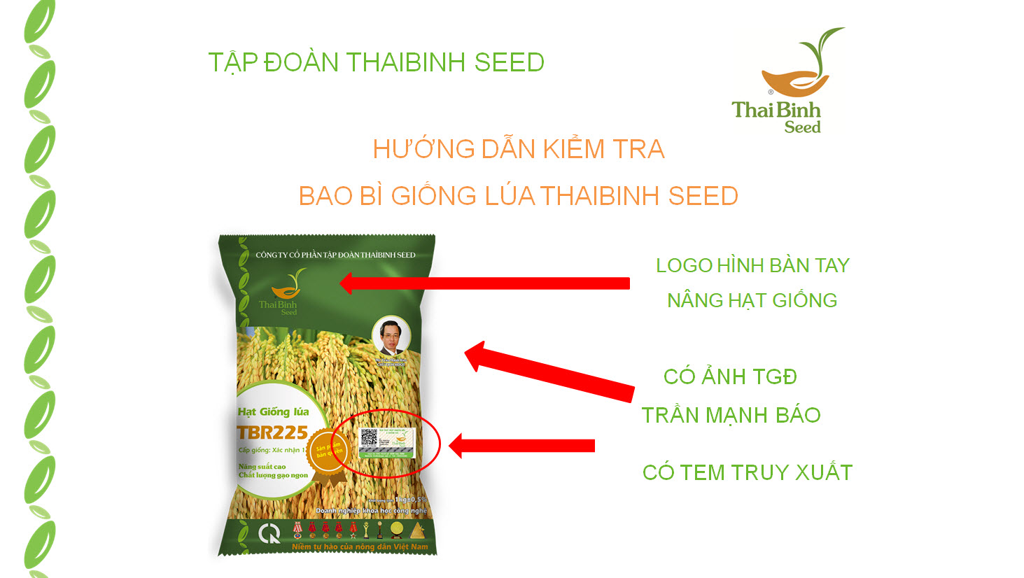 Hiện nay, ThaiBinh Seed đang xuất giống tới các chi nhánh, đại lý. Để mua được đúng lúa giống do ThaiBinh Seed sản xuất, ngoài việc mua tại các đại lý uy tín, HTX nông nghiệp, ThaiBinh Seed khuyến cáo nông dân căn cứ vào các điểm nhận dạng trên bao bì sản phẩm: có logo thương hiệu; có hình ảnh của Chủ tịch Hội đồng quản trị, Tổng giám đốc ThaiBinh Seed; có tem chống hàng giả, hàng nhái; có tên công ty, địa chỉ in mặt sau bao bì.