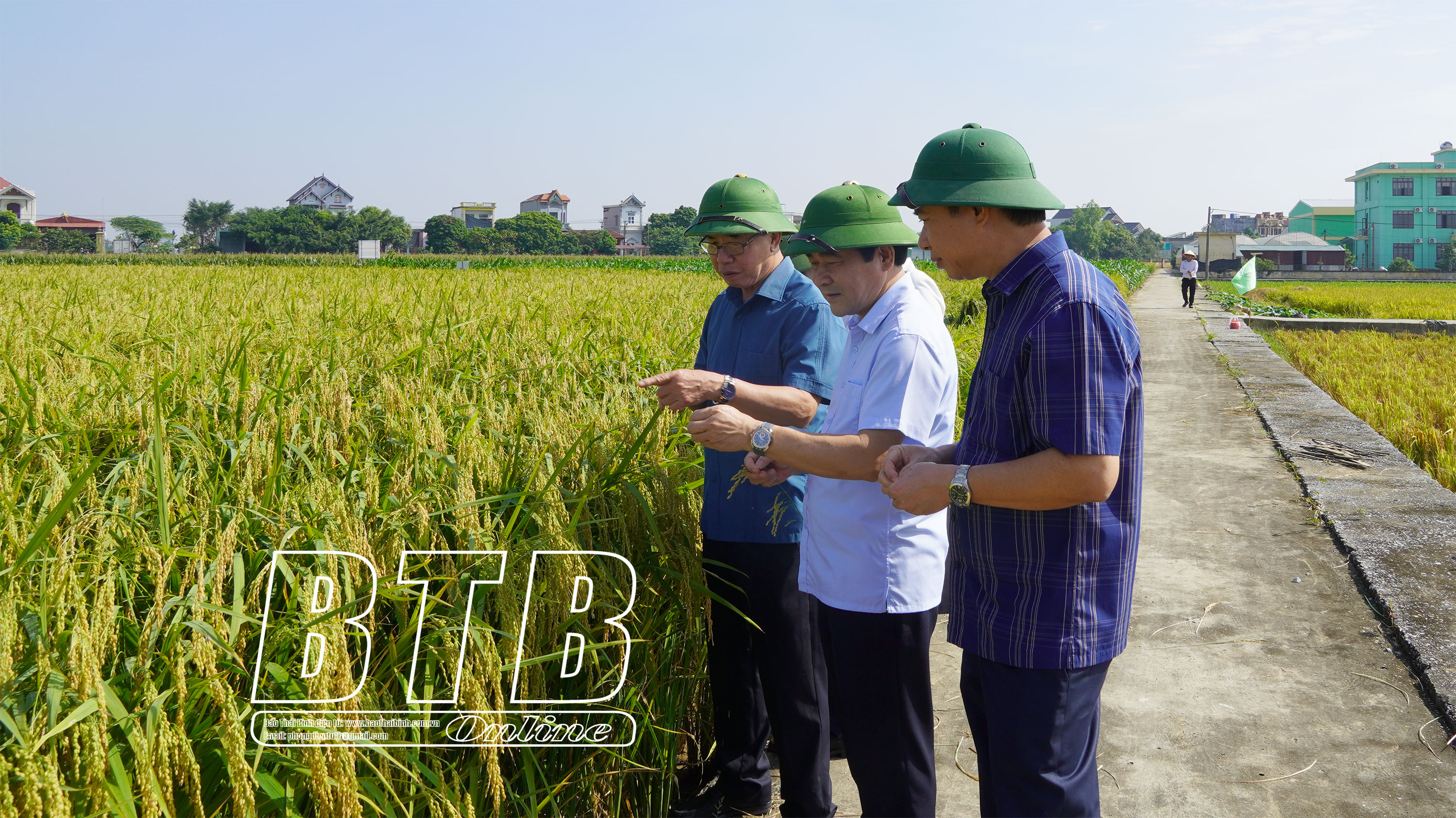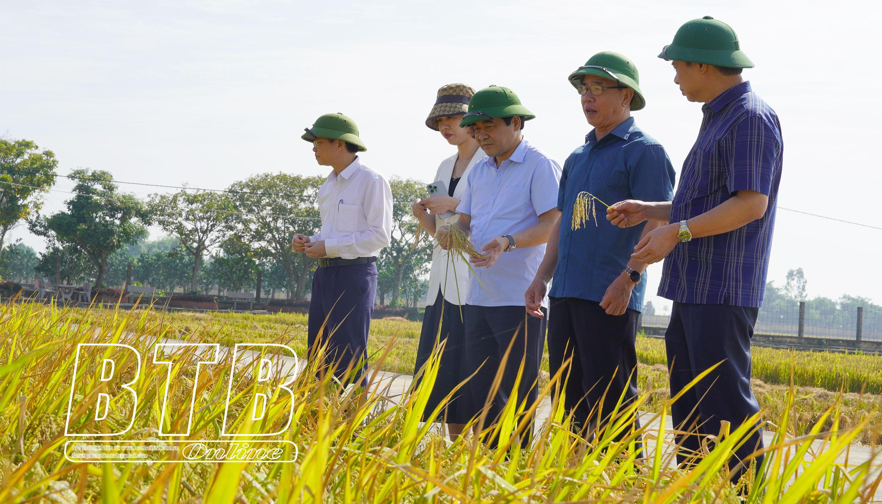 Đồng chí Nguyễn Tiến Thành, Phó Bí thư thường trực Tỉnh ủy, Chủ tịch HĐND tỉnh cùng các đồng chí trong đoàn thăm mô hình sản xuất giống lúa TBR39.