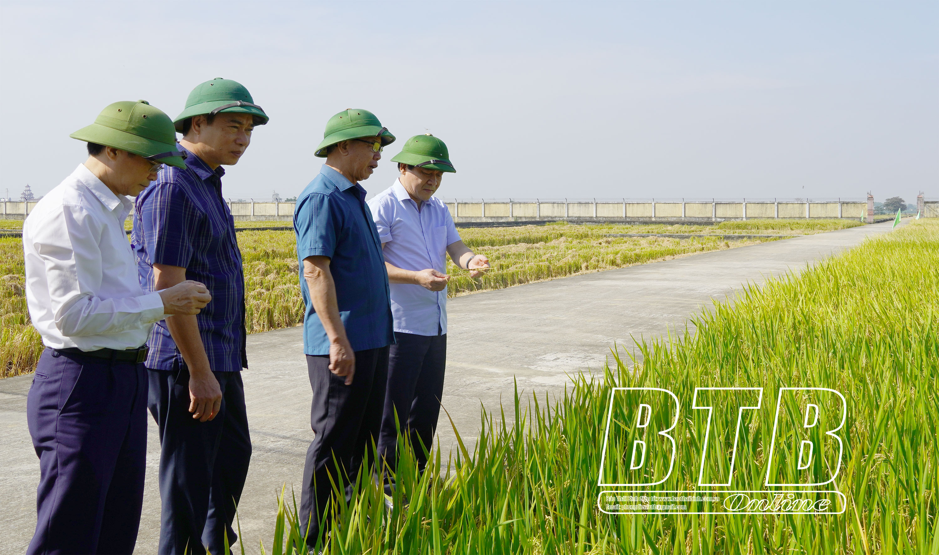 Đồng chí Nguyễn Tiến Thành, Phó Bí thư thường trực Tỉnh ủy, Chủ tịch HĐND tỉnh cùng các đồng chí trong đoàn thăm mô hình sản xuất giống lúa chất lượng cao của Công ty Cổ phần Tập đoàn ThaiBinh Seed.