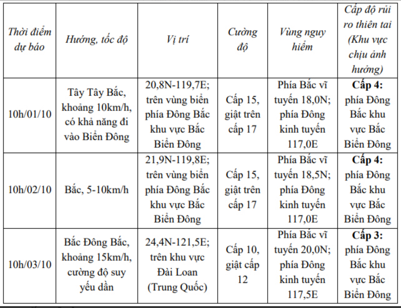 Dự báo tác động của bão, Trung tâm cho biết, vùng biển phía Đông Bắc khu vực Bắc Biển Đông gió mạnh cấp 6-7, từ gần sáng ngày 1/10 mạnh lên cấp 8-9, sóng biển cao 2-4 m, sau tăng lên cấp 10-12,vùng gần tâm bão cấp 13-15, giật trên cấp 17, sóng biển cao 7-9 m; biển động dữ dội.