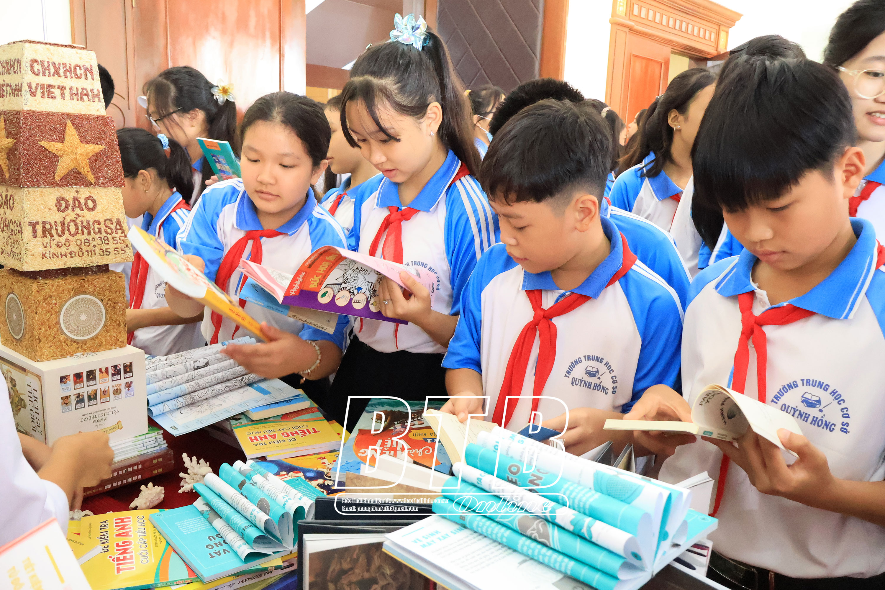 Học sinh Trường THCS Quỳnh Hồng (Quỳnh Phụ) hào hứng đọc sách tại gian trưng bày.