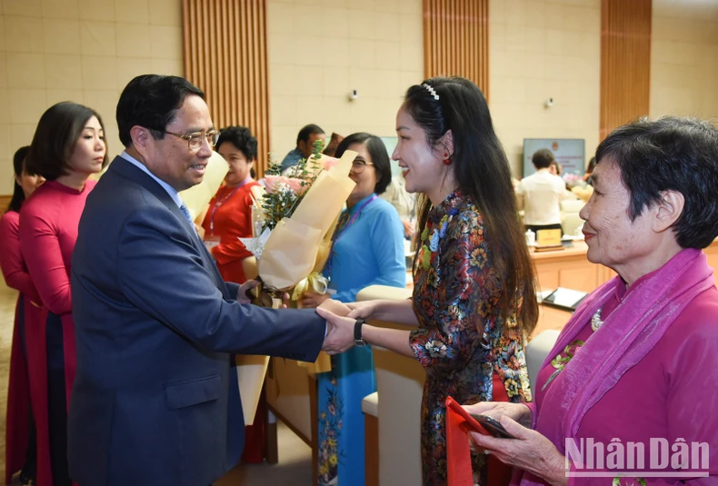 Thủ tướng Phạm Minh Chính tặng hoa chúc mừng các nữ đại biểu. (Ảnh: TRẦN HẢI).