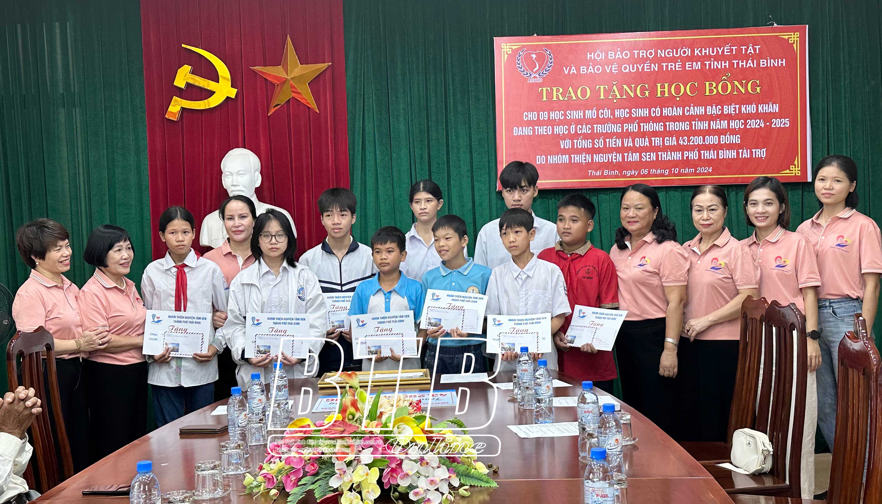 Sáng ngày 6/10, Hội Bảo trợ người khuyết tật và Bảo vệ quyền trẻ em tỉnh phối hợp với nhóm thiện nguyện Tâm Sen (thành phố Thái Bình) tổ chức trao 9 suất quà, 2 chiếc xe đạp và 90kg gạo, tổng trị giá 50 triệu đồng cho 9 học sinh khuyết tật, mồ côi, học sinh có hoàn cảnh đặc biệt khó khăn tại các huyện: Kiến Xương, Vũ Thư, Quỳnh Phụ, Thái Thụy và Tiền Hải. Toàn bộ nguồn kinh phí do nhóm thiện nguyện Tâm Sen tài trợ.