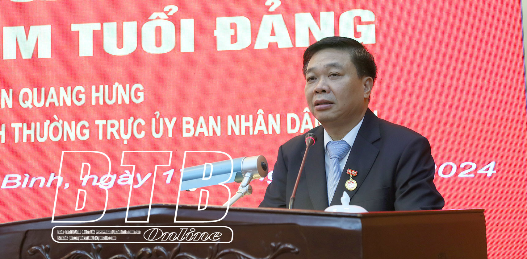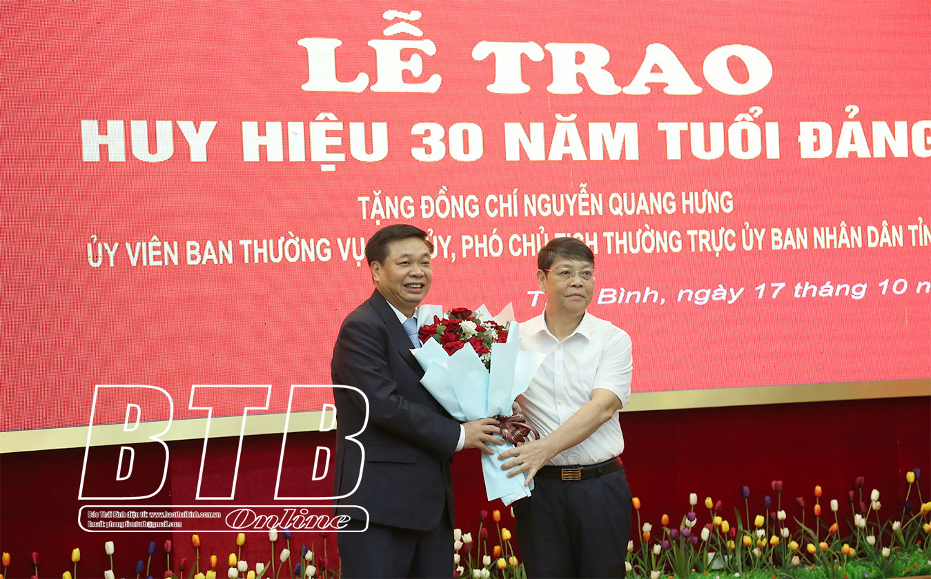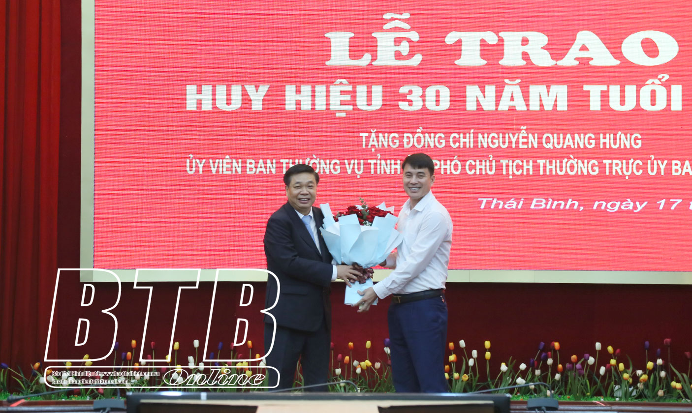 Tại buổi lễ, đồng chí Nguyễn Tiến Thành, Phó Bí thư thường trực Tỉnh ủy, Chủ tịch HĐND tỉnh đã trao Huy hiệu 30 năm tuổi đảng và chúc mừng đồng chí Nguyễn Quang Hưng, đồng thời khẳng định việc trao Huy hiệu Đảng là dịp để Đảng bộ tỉnh ghi nhận và tri ân những cống hiến của đồng chí Nguyễn Quang Hưng cho sự nghiệp cách mạng của Đảng và sự phát triển của địa phương.