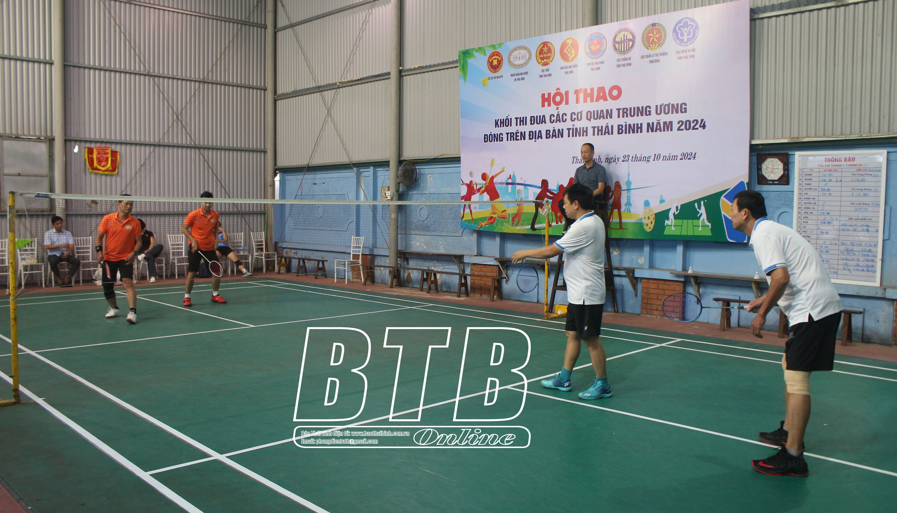Thi đấu nội dung đôi nam môn cầu lông giữa Kho bạc Nhà nước Thái Bình và Ngân hàng Nhà nước Chi nhánh tỉnh.