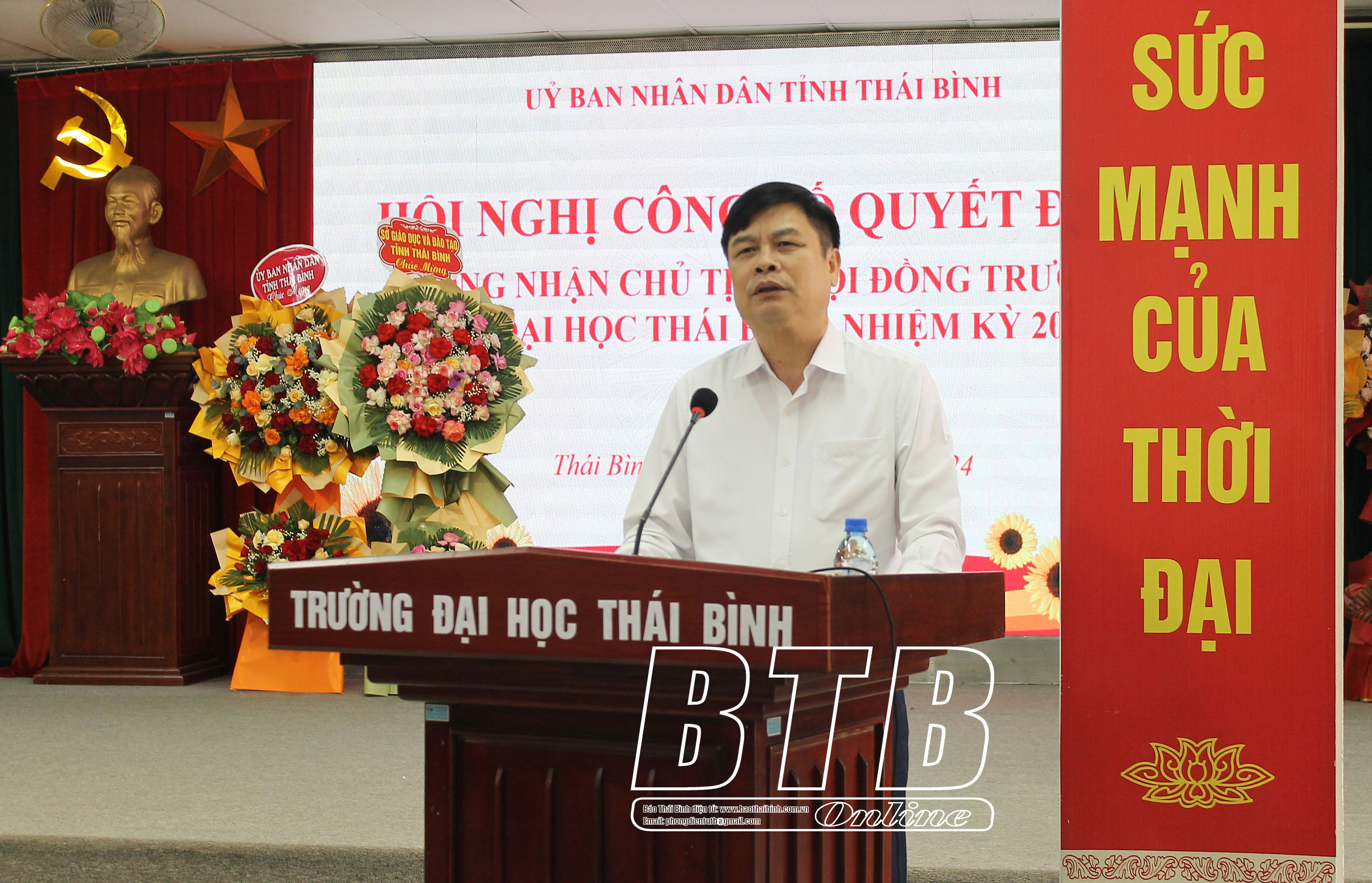 Trao quyết định, tặng hoa chúc mừng tân Chủ tịch Hội đồng Trường, đồng chí Phạm Văn Nghiêm, Tỉnh ủy viên, Phó Chủ tịch UBND tỉnh đề nghị Đảng ủy, Hội đồng Trường, Ban giám hiệu và tập thể cán bộ, giảng viên, người lao động của Trường phát huy tinh thần dân chủ, khắc phục mọi khó khăn, đoàn kết cùng nhau xây dựng Trường Đại học Thái Bình trở thành trường đại học định hướng nghiên cứu đa ngành, đa lĩnh vực, sớm trở thành thành viên của Đại học Quốc gia. Hội đồng Trường phát huy tối đa vai trò trong tư vấn, xây dựng định hướng, hoạch định chiến lược, kế hoạch để phát triển bền vững, nâng cao vị thế của Trường.