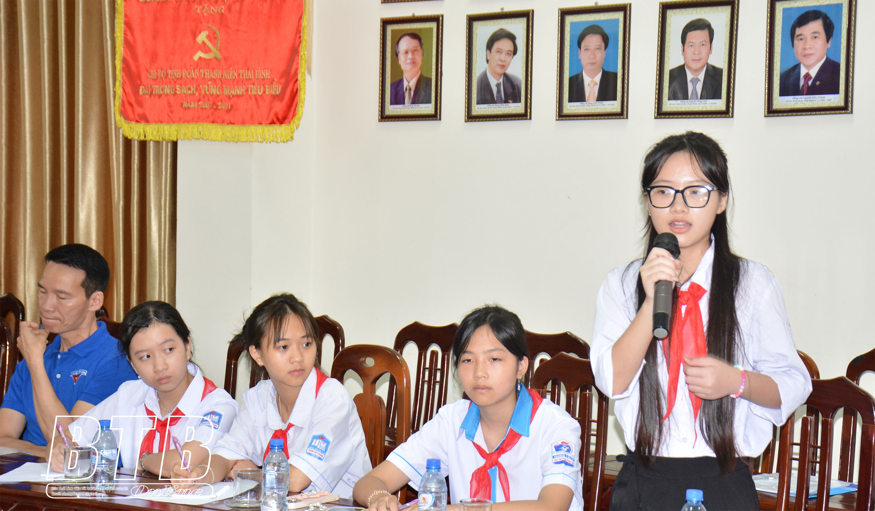 Em Vũ Thảo Ly (thứ nhất từ phải sang), Trường THCS 14/10 (Tiền Hải) tham gia chương trình tiếp xúc “Cử tri trẻ em”.