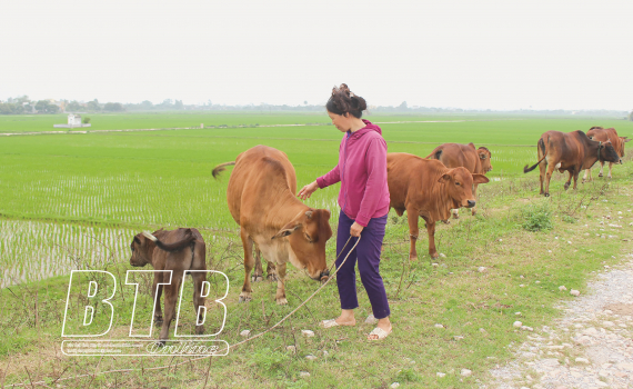 Gia đình bà Phạm Thị Sen (thôn Thanh Long, xã Đông Hoàng, huyện Đông Hưng) phát triển mô hình nuôi bò từ nguồn vốn ưu đãi của Chính phủ.