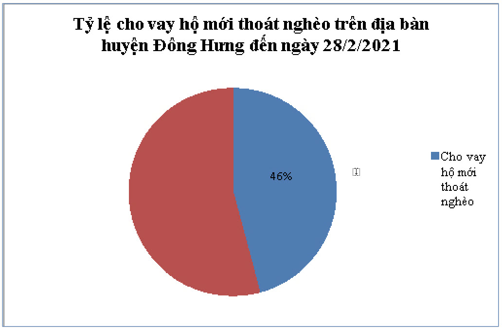 Tại Phòng giao dịch Ngân hàng CSXH huyện Đông Hưng, chương trình cho vay hộ mới thoát nghèo là một trong những chương trình chiếm tỷ lệ dư nợ cao so với tổng dư nợ cho vay của Phòng giao dịch. Đến hết ngày 28/2/2021, trên địa bàn huyện Đông Hưng có 4.408 khách hàng đang vay vốn chương trình hộ mới thoát nghèo với dư nợ 191,908 tỷ đồng, chiếm 45,82% tổng dư nợ cho vay; tỷ lệ nợ xấu chiếm 0,13% tổng dư nợ cho vay. Để nguồn vốn nhanh chóng đến đúng đối tượng thụ hưởng, thời gian qua, Phòng giao dịch Ngân hàng CSXH huyện Đông Hưng duy trì phối hợp với các tổ chức hội, đoàn thể để ủy thác cho vay nguồn vốn chương trình cho vay hộ mới thoát nghèo. Đến nay, toàn huyện có 121 tổ chức hội, đoàn thể cấp xã nhận ủy thác cho vay qua 376 tổ tiết kiệm và vay vốn.
